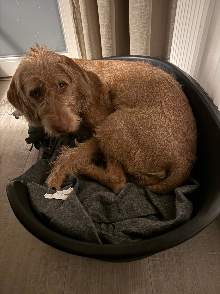 Als Noor “alleen” moet blijven sleept ze steeds mijn spullen mee in haar mand. Dat kan een fllecevest van de stoelleuning zijn maar ook een theedoek of handdoek van de haakjes in de keuken zijn. Als tussenoplossing krijgt ze tegenwoordig een fleecedekentje, die ik zelf gebruikt heb, in de mand. En klaar is het met het lenen van mijn andere spullen😊.