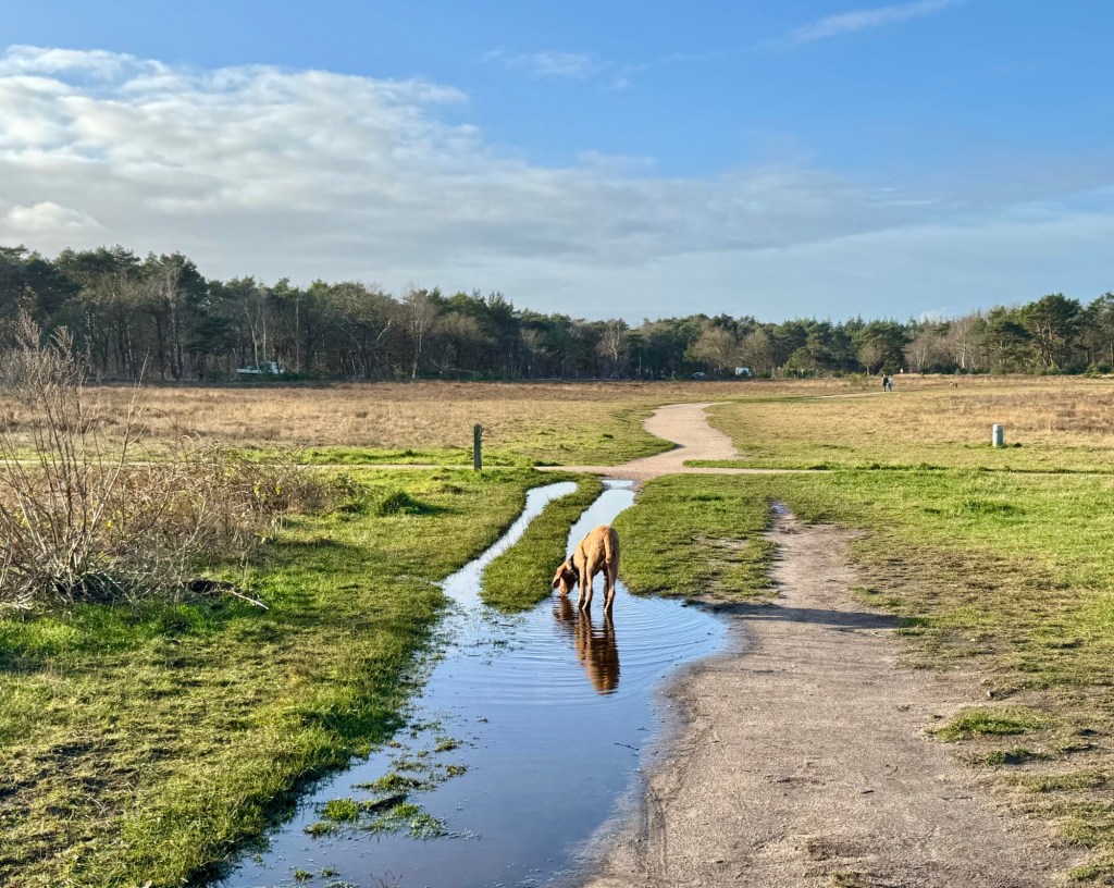 Mooi gebied om te wandelen met de honden. We treffen op de route de leuke Beagle die we eerder zagen en Noor vindt hem het einde. Samen sjezen ze over de hei; best spannend ver weg maar ze komt samen met de Beagle terug op de fluit. De Beagle is overduidelijk goedgekeurd door Amy en Rebel want ze bemoeien zich er geheel niet mee. (Of is het eindelijk even genieten van de ontstane rust??) Meerdere leuke en sociale honden getroffen. Prima ervaring voor Noor; dit staat weer mooi op de interne harde schijf. Eén Rhodesian reu vond ik persoonlijk niet prettig reageren naar Noor; ze vond hem eng en hij kwam achter haar aan op haar weg terug naar ons. Maar daar is dan weer dat kleine mannetje aan de lijn die met een grom aangeeft dat hij nú beter kan ophouden want ze hoort bij hem. Die boodschap komt prima door.