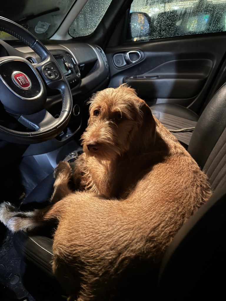 Dan kom je buiten en is de maan niet meer zichtbaar door de dikke bewolking. In het stikdonker de auto opzoeken door steeds te ontgrendelen met de sleutel. Zo stikdonker dat ik de loopplank niet uit wil klappen dus dan Noor maar voorin. Dat kwam haar maar raar voor maar met enige aandrang stapte ze toch maar in. Bij het wegrijden stortte ze al in slaap :). Op de terugweg even snel langs de winkel en haar maar voorin gelaten. Kom je terug bij de auto tref je dit: