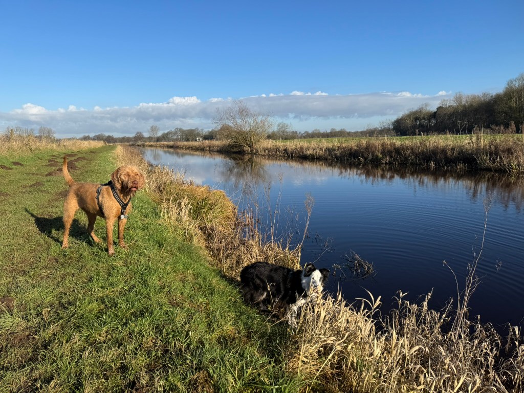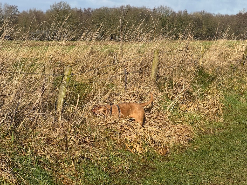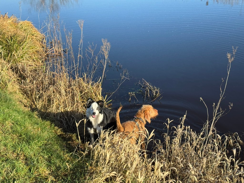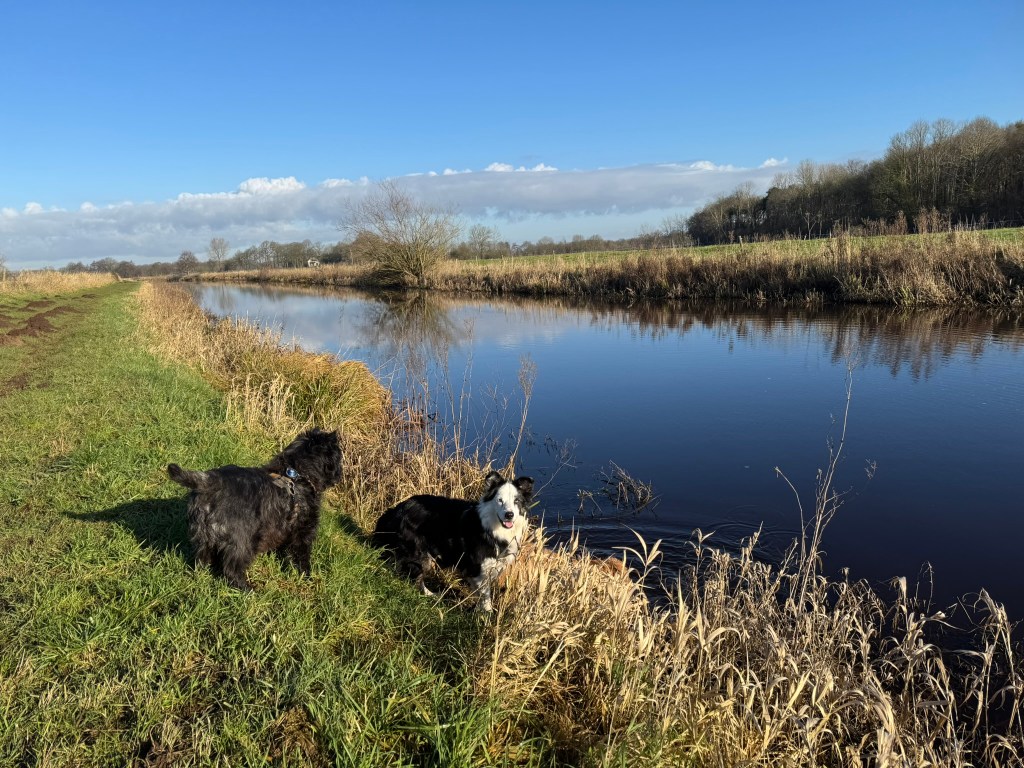 Amy heeft sinds lang tijd weer es gezwommen onder toeziend oog van Noor, die weigert het water verder in de gaan dan alleen met de pootjes. Maar ze gaat er al verder in dan eerst het geval was dus ik ben er blij mee. Onder de modder terug naar de auto en bij thuiskomst Amy en Noor in de bench om op te drogen. Daar start Noor ook nog even met een grote benchverbouwing; bodemplaat er uitwerken maar vervolgens er ook weer in, aanvallen op de dekens om dan ineens na 10 minuten neer te storten en sabbelend op haar dekentje in slaap te vallen. Wat heeft die hond een energie vandaag!