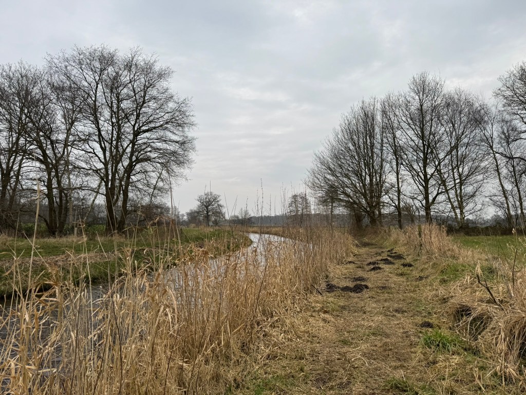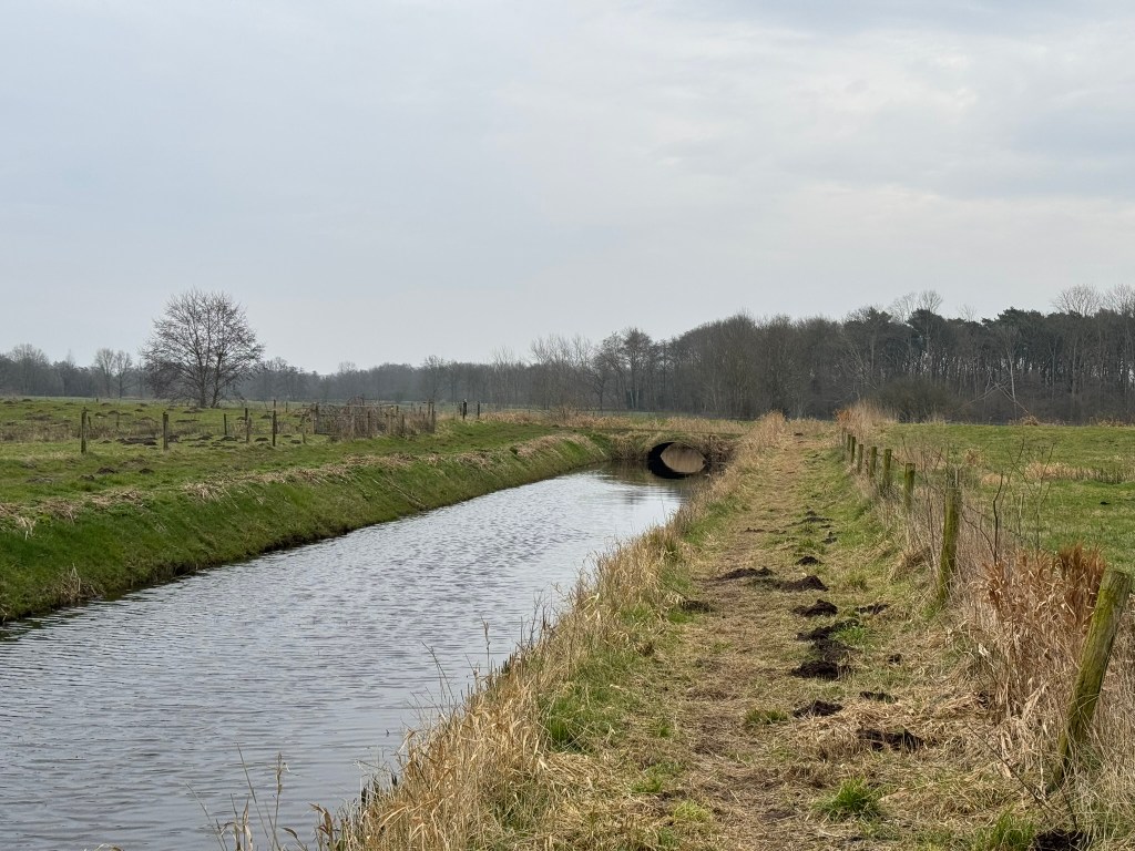 Dan gaan we afslaan en op dat punt heb je een keuze uit links van de sloot of rechts. Ik kies voor de linkerkant en daar is Noor nog nooit langs geweest. Zij kiest vrolijk voor rechts en loopt op gelijke hoogte mee met Amy aan de linkerkant. Ik roep haar en ze raakt in dilemma en lijkt het maar niet te snappen. En dan ga ik wachten tot ze het zelf oplost; terug of over de sloot zwemmen. Maar nee hoor, Rebel ziet zijn vriendin in lichtelijke stress en keert het hele stuk om en gaat naar haar toe. Hij loopt tot hij bijna bij haar is, keert om, wacht op haar maar ze snapt het nog niet. Dan loopt ie weer een stukje naar haar toe en draait weer. Als ik ze vervolgens roep komt ze mooi achter hem aan gesjeesd. Zwaar geval van Liefde is.