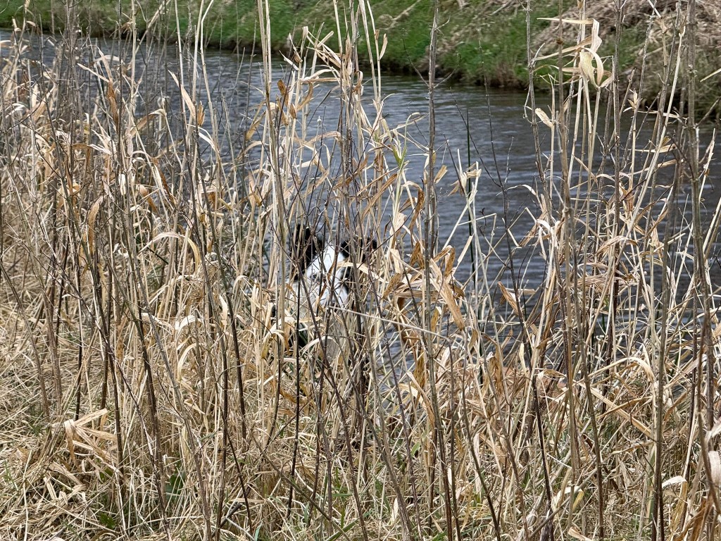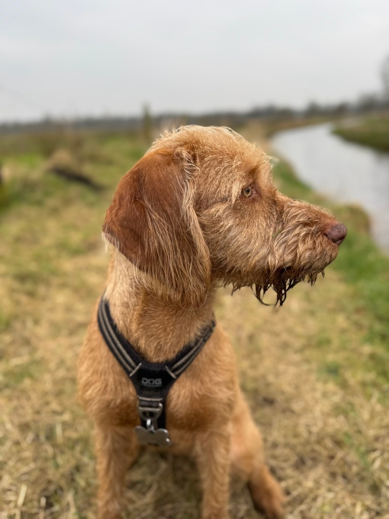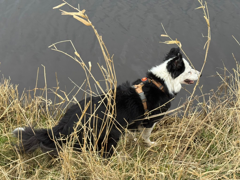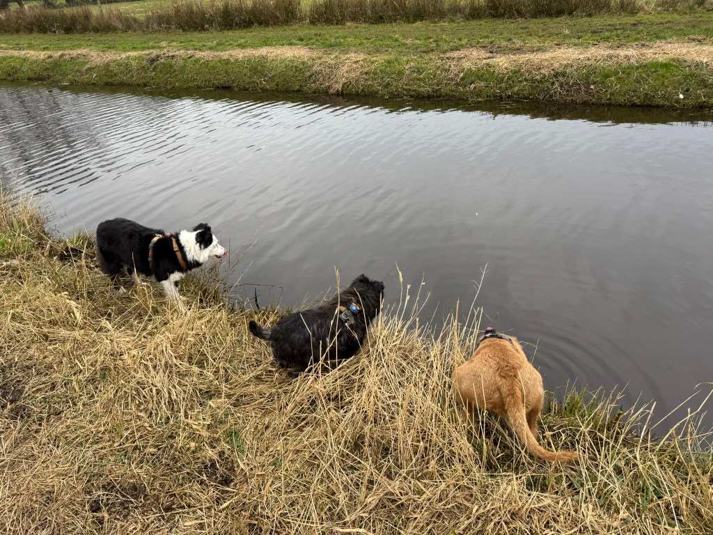 Amy wil vervolgens graag zwemmen en gaat een paar keer te water. Noor wordt hierop ook wat dapperder en staat met de poten in het water op de terugkomst van Amy te wachten. Ze zwemt zelf niet maar wordt wel kletsnat… en dan kun je er gewoon op wachten: zoomies. Dit gaat langs de slootkant, ik ben er niet kapot van door het hellende gedeelte dat niet zo goed is voor een jonge hond, maar ze heeft het overduidelijk even nodig. Minder is dat ze Rebel hierbij volledig over het hoofd ziet en het water in lanceert. Tot zover de wederzijdse liefde.