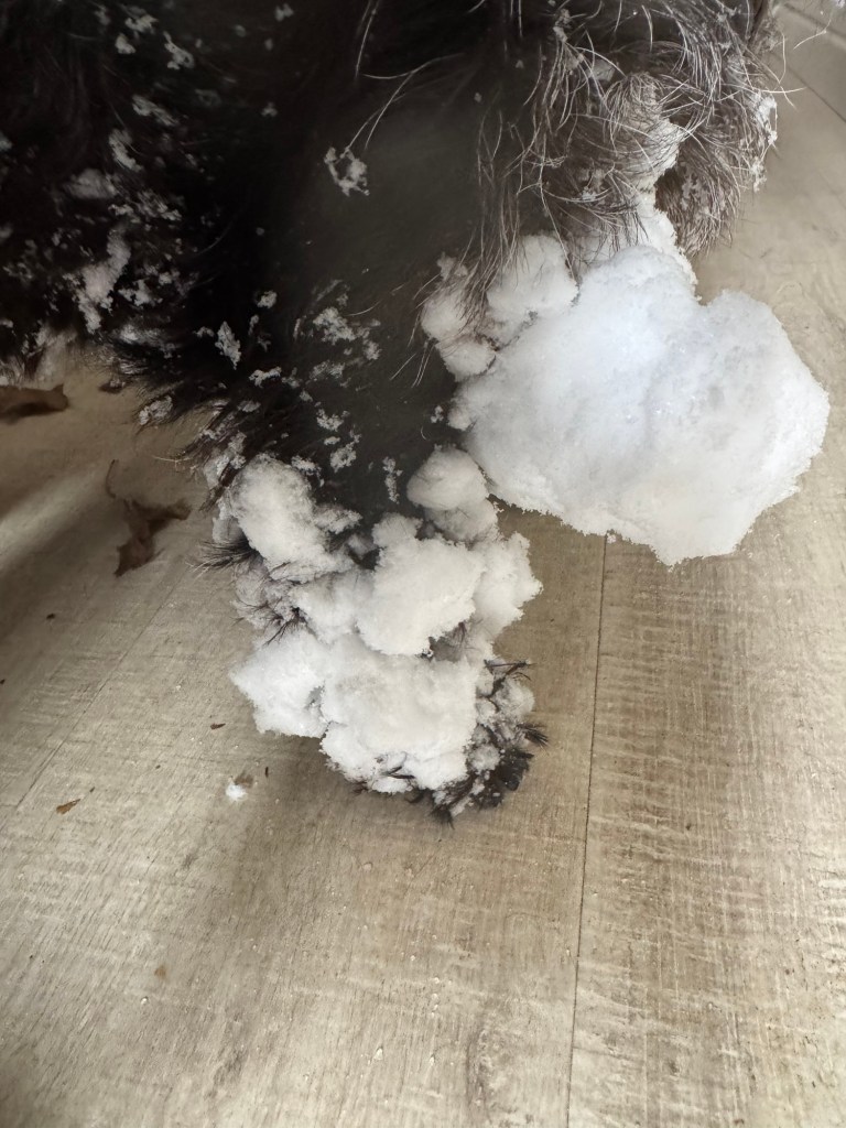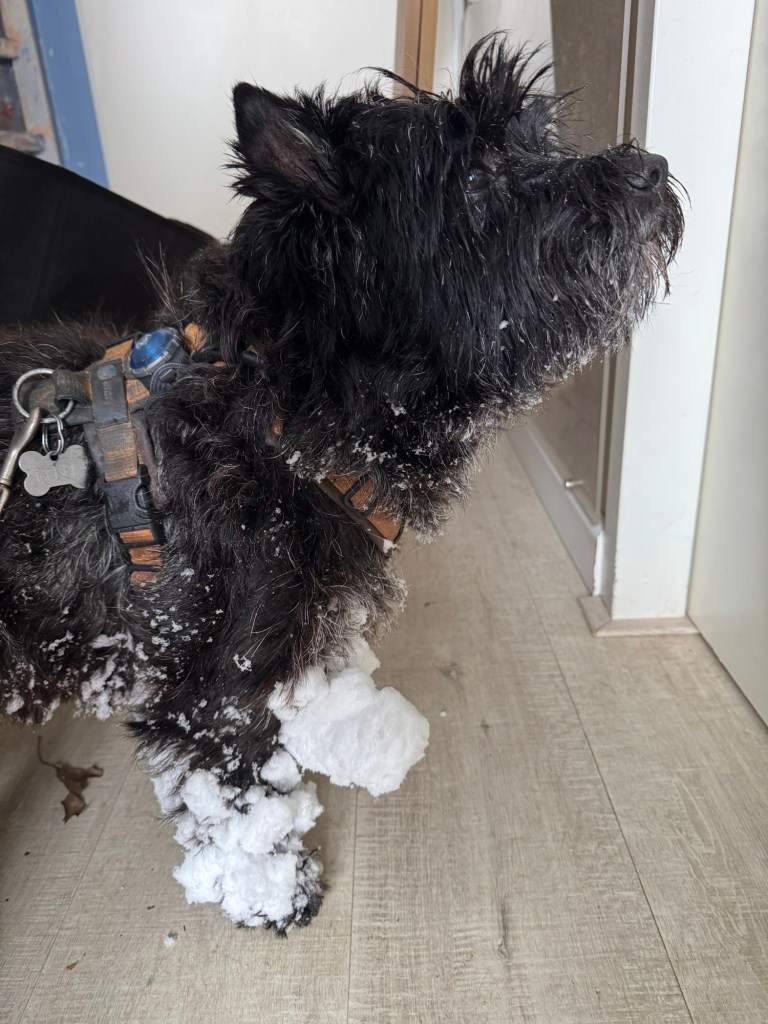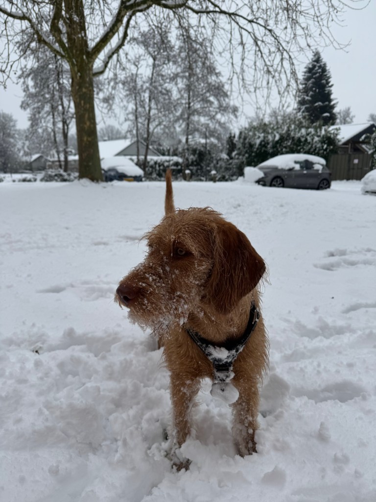 Waar Noor dolblij is met de sneeuw, veranderd Rebel in een halve sneeuwpop waardoor hij amper vooruit komt: