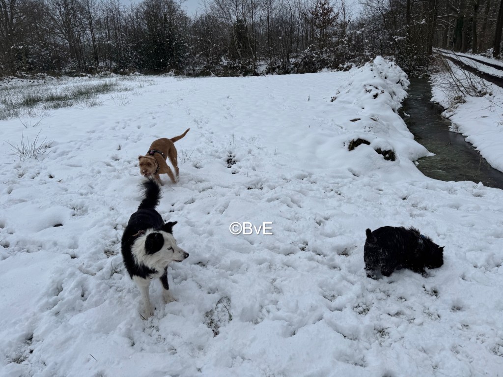 Amy wilde absoluut zwemmen maar na een korte plons in het diep dacht ze hier toch anders over en was het gedaan met de waterpret. Noor traceert nog een stel eenden aan de waterkant, houdt ze scherp in de gaten maar is niet van plan hier achter aan te gaan. Bij de auto aangekomen Rebel verlost van zijn sneeuwpoten en dan weer naar huis voor een ochtendje met luierende honden.