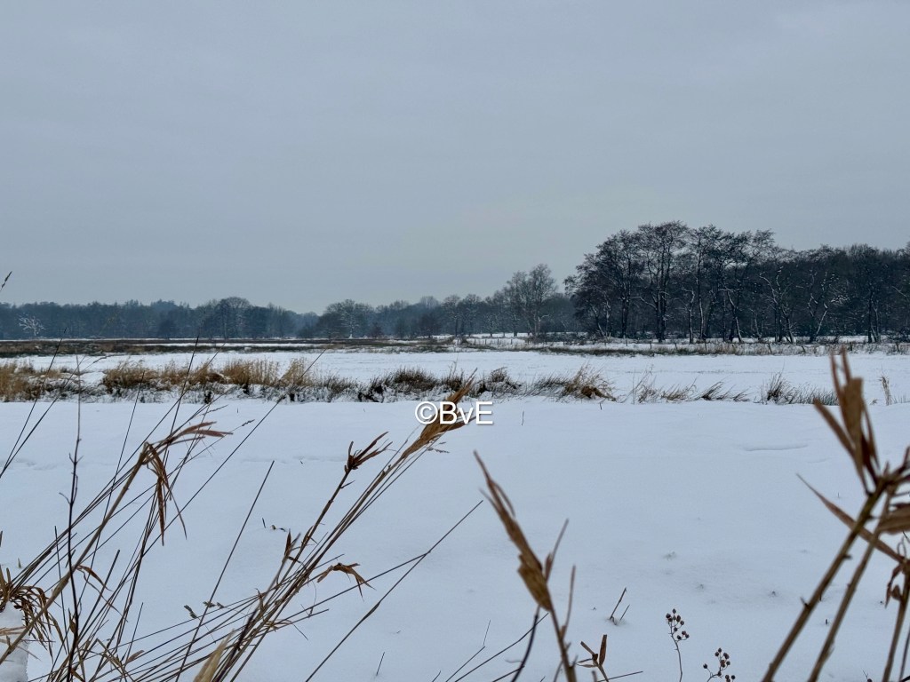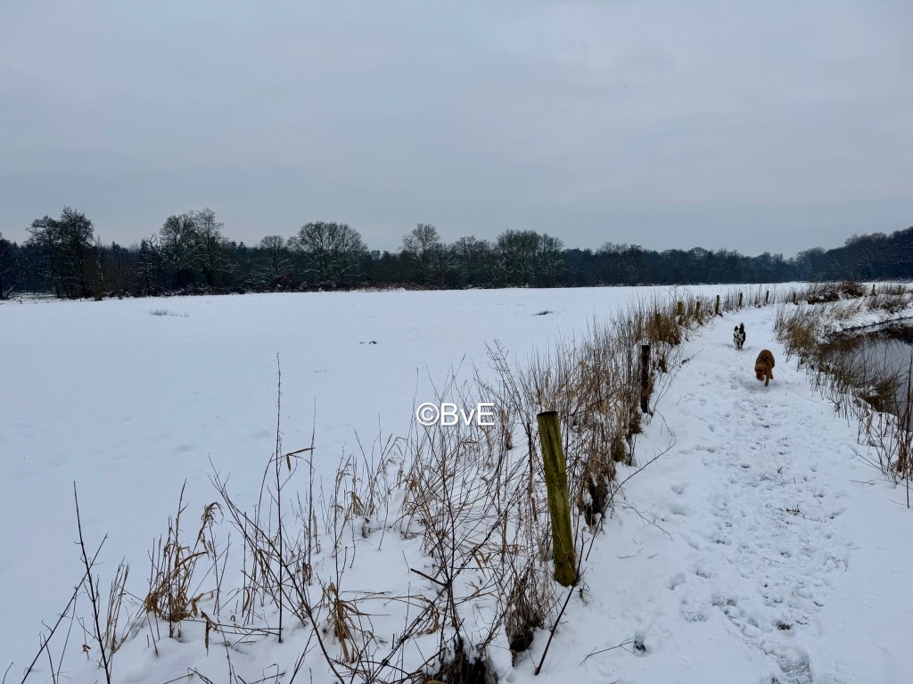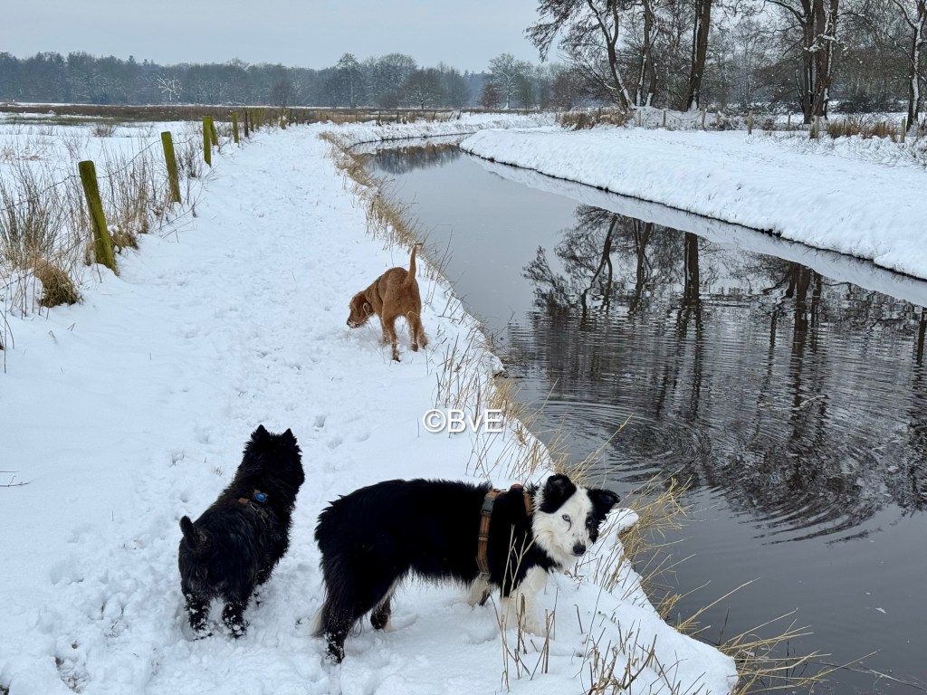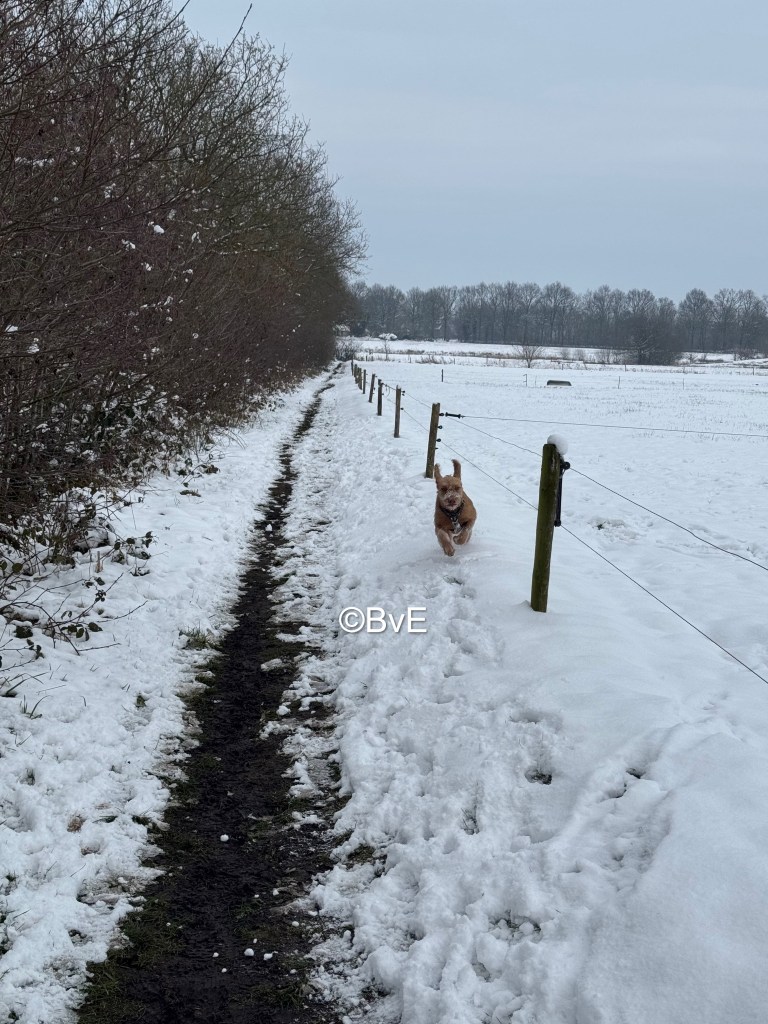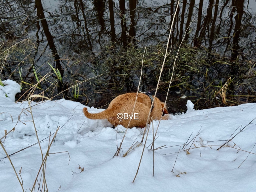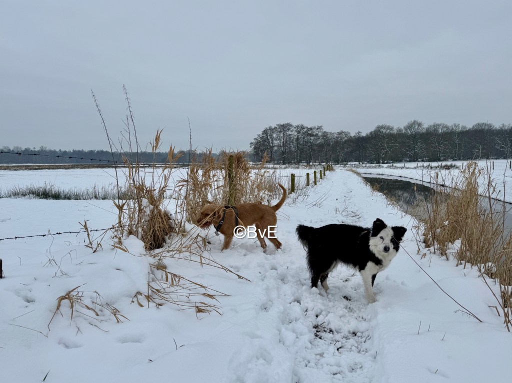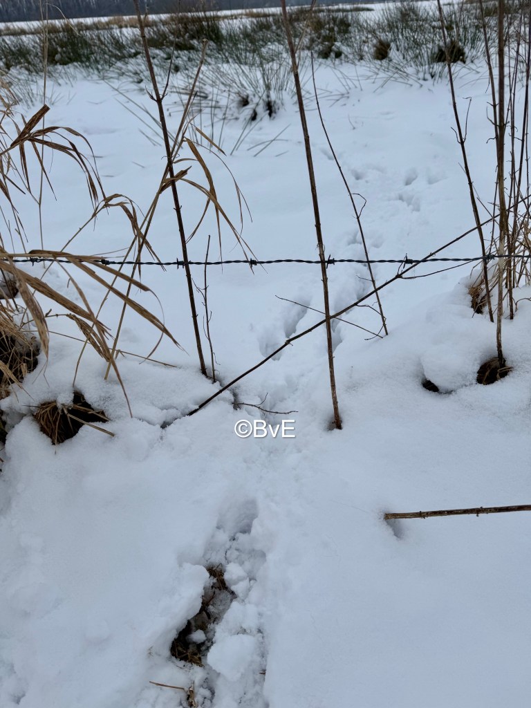 Verder gelopen en vandaag Noor de vrijheid maar es gegund op het smalle pad langs het schrikdraad. Door de sneeuw moet dit draad nu heel goed zichtbaar voor haar zijn, dus ik vind dit een goed leermoment. Ze raakt het draad ook nergens, gaat er wel één keer onderdoor maar komt direct terug als ik het vraag. Dan langs het diep waar Rebel weer onder de sneeuw komt te zitten en dan eindelijk besluit om mijn voetsporen maar te volgen in plaats van door de maagdelijke sneeuw te lopen. Noor heeft het druk met het uitwerken van allerlei sporen die nu door de sneeuw ook voor mij inzichtelijk zijn. We nemen weer het pad aan de droge kant van het diep en deze keer neemt Rebel het pad aan de andere kant. Ik roep hem terug, hij blijft staan kijken en dan gaat Noor hem ophalen. Ik vroeg me serieus af of hij dit nou expres deed om haar te testen of zo.