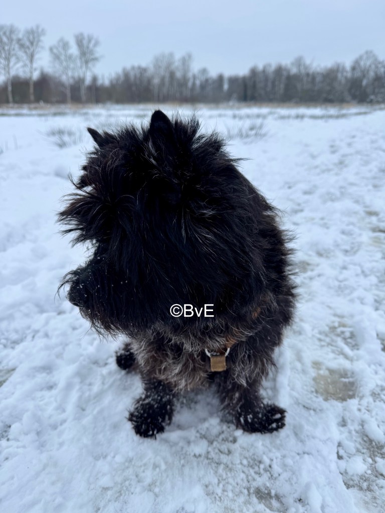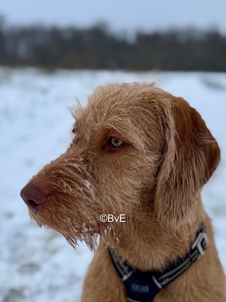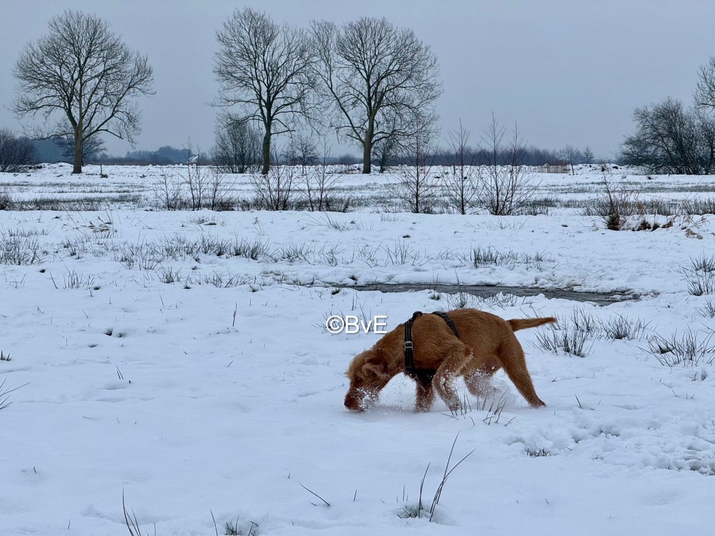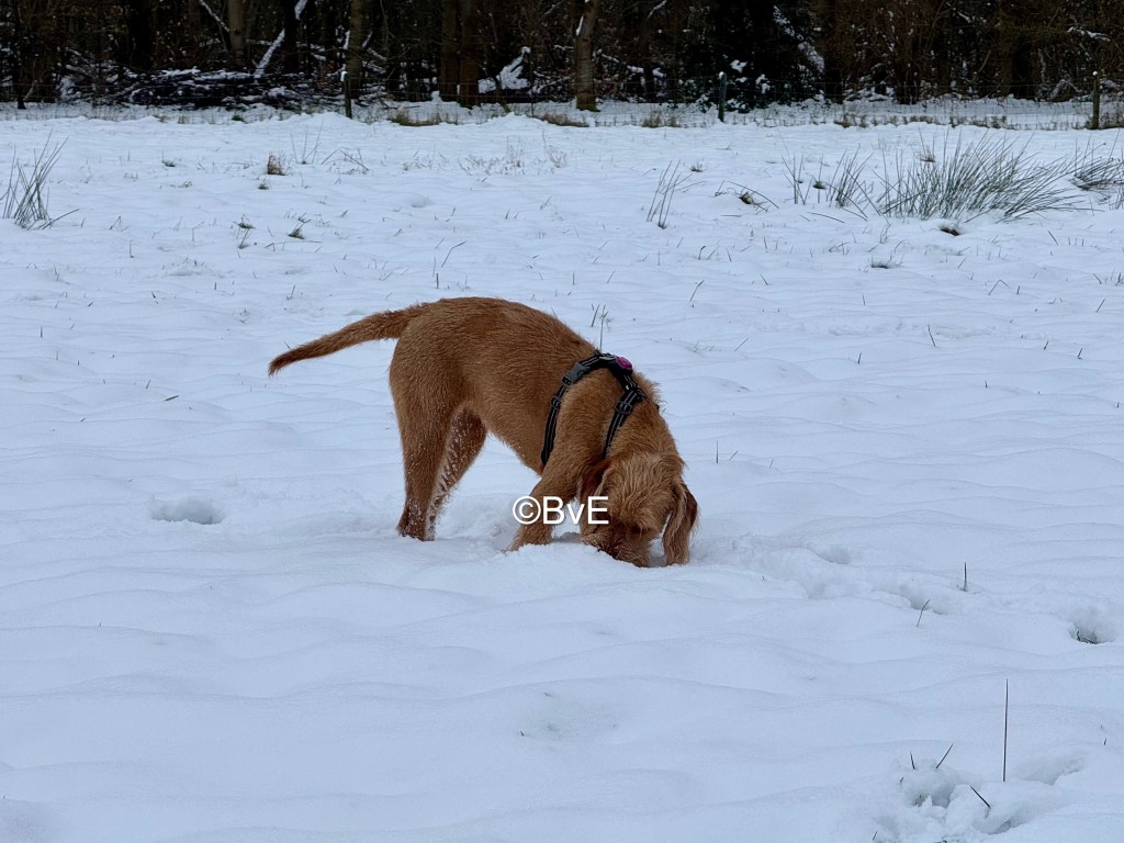 In de middag naar Grolloo. We gingen direct van start met dummywerk en Noor bakte er eerst niets van; ze kon de dummy moeilijk vinden, bracht de dummy een keer bij Robin, schoot mij ver voorbij met terugbrengen enz. Maar dan moeten we met ons vieren de hond per persoon op Zit laten terwijl Robin met dummy’s kliert: hij laat ze vallen, gooit ze omhoog en gooit ze omhoog met geluid. Noor is de enige van ons groepje die de zit volhoudt. De meegenomen worst van thuis is dan dik verdiend! Daarna had ze het koppie er bij. We hebben nog een erg moeilijke oefening gedaan: in tweetal. Eén gooit de dummy op het trainingsveld en vervolgens lopen we het bospad op. We gaan beiden met een volgende hond terug en dan gooit Robin een dummy het bos in, die gehaald wordt door hond nr. 1. Daarna mag hond nr 2 de dummy van het veld ophalen. Noor deed het heel goed in het bos: ze sprong over de struikjes en takjes op het pad en had de dummy snel gevonden. Vervolgens komt ze terug en kruipt onder de struikjes en takjes door. Ze voelde zich volgens Robin nog niet zeker genoeg om met de dummy in de bek een sprongetje te wagen. Dat komt nog… De keer dat Noor de dummy uit het veld mag halen, is ze toch eerst geneigd om te kijken of er geen dummy in het bos ligt. Dat is de moeilijkheid aan deze oefening. Hondsmoe terug naar huis waar Noor niet van schoot te branden is… Helemaal prima want zelf toch best koud geworden ondanks de thermokleding.