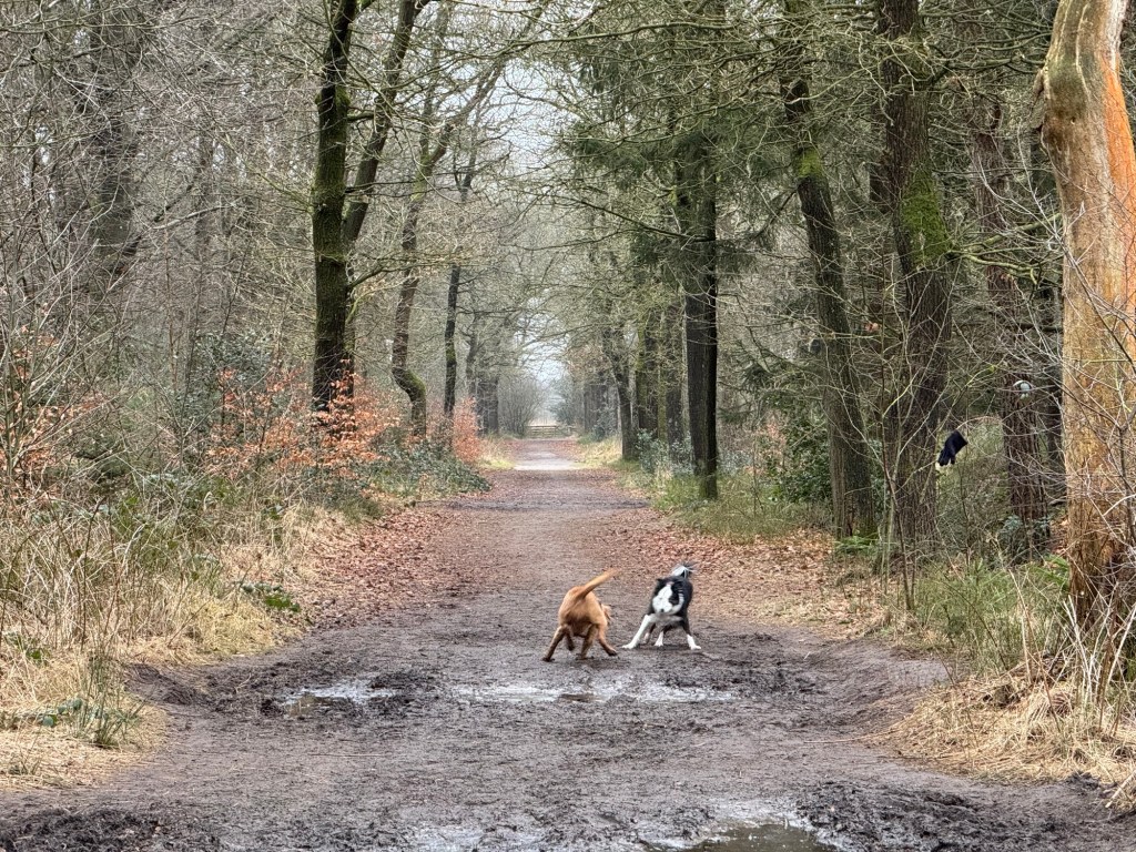 Vanmorgen rondje Mensinghe. De kennels zijn even uit de auto in verband met de aankomende garage-afspraak. Noor samen met Amy achterin gedaan en dat gaat boven verwachting goed. Half en half verwacht je toch dat Noor aan het donderjagen zal slaan maar Amy is in de kofferbak wel heel duidelijk naar haar: op rust want anders… Bij de parkeerplaats de bende gelijk los. Noor is in het bos zelf altijd een stuk drukker dan op niet bos-percelen. Vandaag was het helemaal verschrikkelijk: rennen en botsen met Rebel en Amy. Voor we bij het bosven kwamen had ze d’r tong al op d’r tenen hangen. Amy waagde zich voor een zwem met een prachtige sprong vanaf de hoge kant, Noor besloot dat ze ook in het ven wilde en nam de blubberige d-tour. Wat een lucht..onder de blauwe modder er weer uit en dan Amy die de hoge kant alleen met hulp van mij op kwam. En dan ben je maar wat blij dat het pupsel niet de gewoonte heeft om tegen mensen op te springen. Keurig opgevoed door de vorige eigenaar.