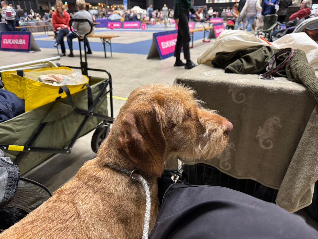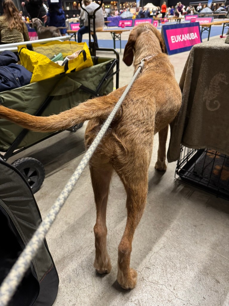 Ook vandaag weer een dagje show. Een half uurtje later dan gisteren vertrokken en het was nog heerlijk rustig in Groningen. Het parkeren was nu wel goed geregeld en we kregen een mooi plekje op een bedrijventerrein. Dan toch blij met de bolderkar: het is nu een stukje verder lopen en je sleept zo’n dag toch een hoop zooi mee. Ons bij de ring geïnstalleerd waar we ons optreden hebben. De bench uitgeklapt, Noor erin met een dekentje en mijn eigen stoel uitgeklapt en lekker rondkijken naar wat er zoal voor me gebeurd. Voor mij zit een Engelse dame met een Duitse Staande korthaar: een plaatje van een reu. Mevrouw is aan de beurt en gaat de ring in. Vervolgens komt ze na afloop ronduit briesend terug, de hond wordt niet echt vriendelijk in de kennel gestopt en ze komt bij mij uitleggen wat er mis is. De Zwitserse keurmeester had dus tegen haar gezegd dat zijn voeten niet mooi genoeg waren en adviseerde de eigenaar om vooral buitenshows te lopen zodat de voeten van de hond minder zichtbaar waren door het gras. Tja, wat zeg je dan he? Gelukkig waren er nog veel meer mensen met wie ze dit kon bespreken.. Daarna werd alles snel ingepakt en verdween mevrouw… Dan toch nog maar even naar het toilet voor de Vizsla’s aan de beurt zijn. Noor meegenomen en dan dankbaar voor het feit dat ze, toen ze net bij mij kwam, steeds mee ging het toilet in. Nu vond ze het dan ook de normaalste zaak van de wereld om samen opgesloten te zitten in die kleine ruimte. En dan op zit blijven tijdens mijn handen wassen en handen drogen terwijl er zoveel dames heen en weer sjouwen. Zwaar beloond voor dit ontzettend goede gedrag.