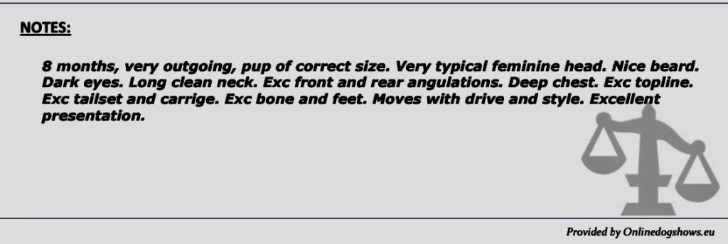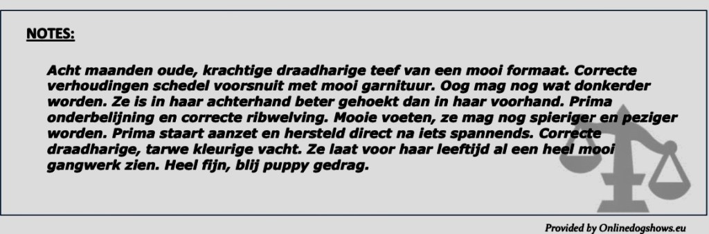 Als de Vizsla’s bijna aan de beurt zijn tref ik mijn oude trainingsmaatje weer met haar hond Loïs. Ze sluit gezellig bij mij en bij mijn nieuwe buurvrouw met haar Heidewachtel aan. Veel ervaringen uitgewisseld en gegevens van leuke hondenactiviteiten en goede speur-jacht-trainers. Als Loïs’ ronde geweest is, ga ik met Noor even naar het buitenterrein. Noor plast zo snel mogelijk en wij kunnen vlot weer naar binnen. We wachten netjes tot we de ring in mogen en nu we weten wat er precies van ons verwacht wordt, loop ik zelfverzekerd met Noor richting keurmeester. En dan zie je de weerslag op Noor: ze loopt werkelijk keurig met me mee. We staan stil bij de keurmeester en die maakt een praatje en betast Noor. Die veranderd daarop uiteraard in een nog blijer ei dan ze al is en de keurmeester is vertederd. Noor wordt geknuffeld en dan wil de keurmeester de tandjes bekijken. Als ik zie dat Noor dit maar een zozo dreigt te gaan vinden, zeg ik vlot: tandjes kijken – goed zooo. Dan verloopt het probleemloos. We mogen weer een rondje en ik heb Noor nog nooit zo mooi aan een spanningloos showlijntje naast mij gehad. Wat een focus!! Prachtig gewoon. We lopen nog een mooie diagonaal en staan dan stil voor de keurmeester die haar tekst dicteert aan de tafelmedewerkers. Vervolgens is ze klaar en maakt mevrouw nogmaals een praatje met mij, ik krijg een handje, Noor een aai en we mogen weg. En weer met een ticket voor de ereronde!