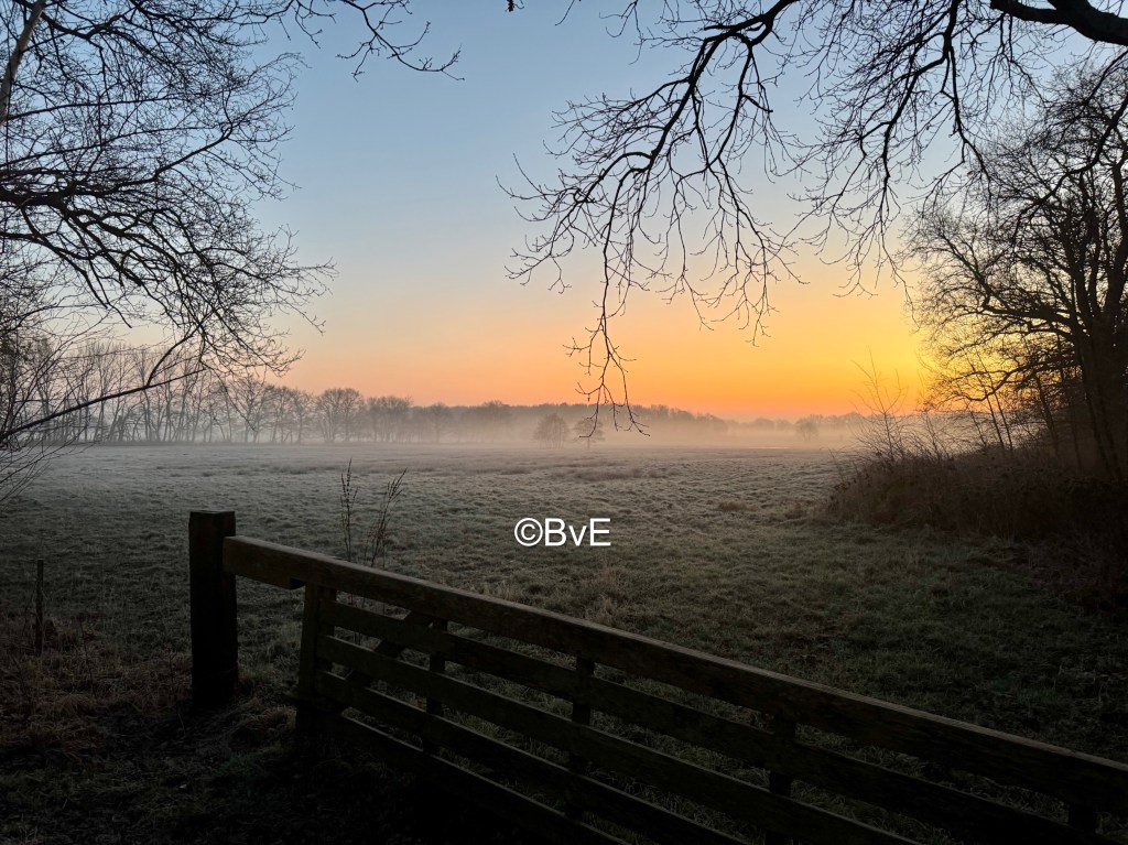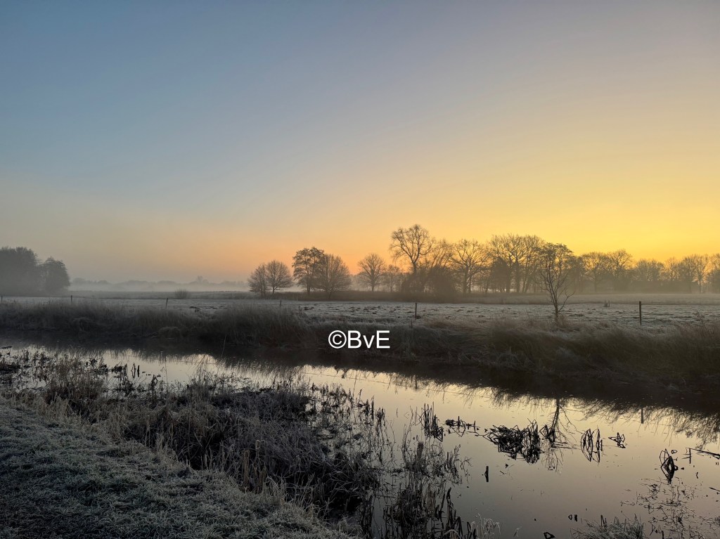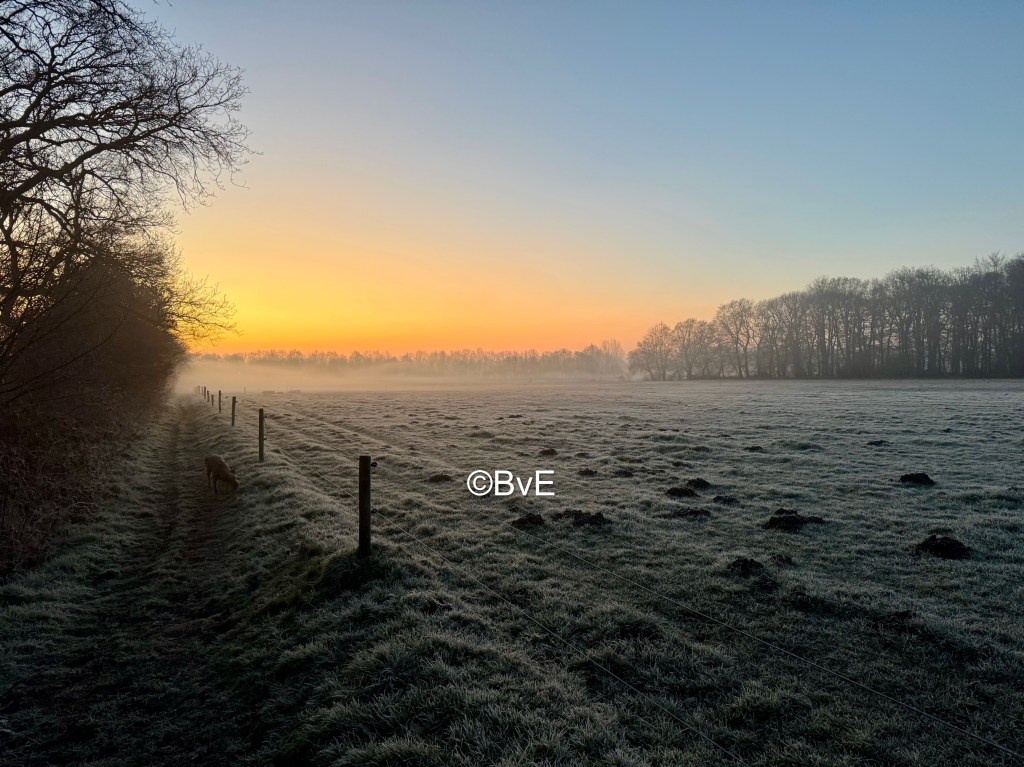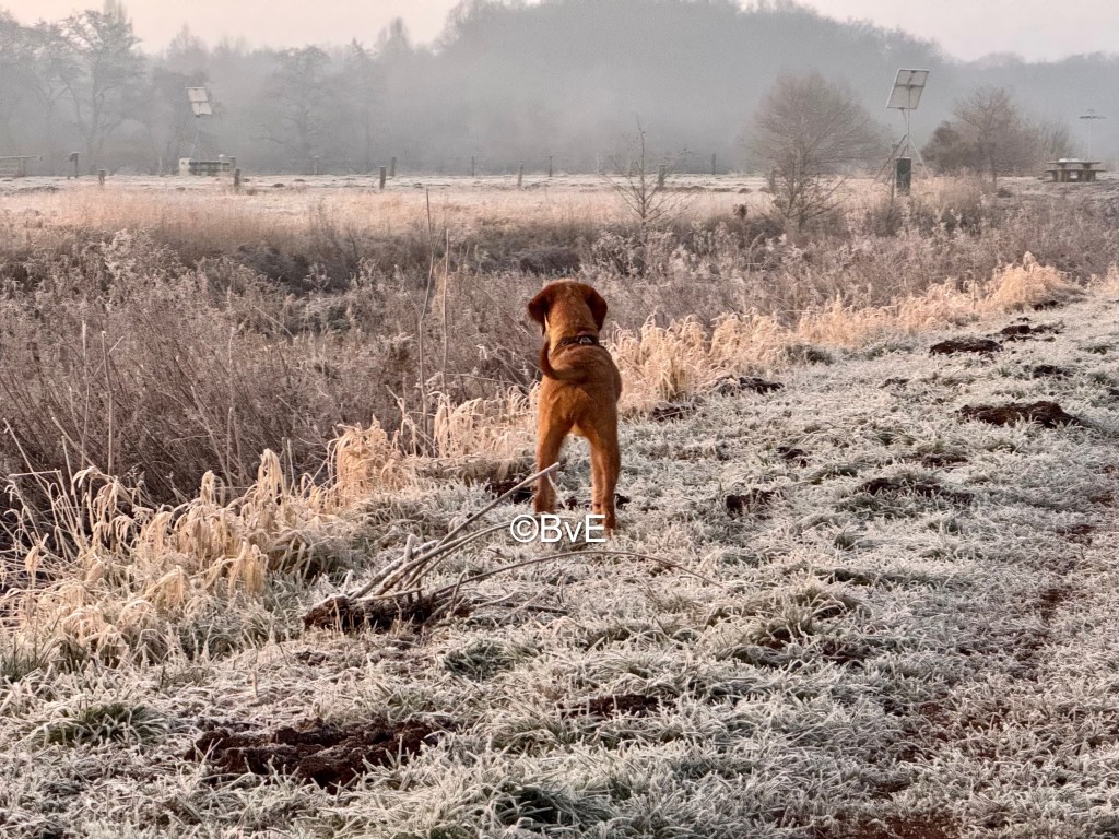Deze koude dag gestart met een rondje Sterrebos. Vanwege het gebrek aan licht maar gestart op het pad naast het bos. De honden hadden het erg druk met snuffelen en ik met foto’s maken plus genieten van de mooie kleuren. Dan maak ik een foto van een mooi plekje en zoals gebruikelijk kijk ik daar even om de hoek om te zien of er aan het eind van het land nog reeën staan. Nou, die stonden er – niet aan het eind maar pontificaal voor mijn neus. Ik weet niet wie het meeste schrok :). Gelukkig realiseerde ik me direct dat Noor achter mij aan komt als ik mijn lijf in een andere looprichting draai, dus me direct omgedraaid om daar op Noor te botsen die al onderweg was. Vanuit mijn ooghoeken zag ik de reeën door het land gaan dus de honden maar snel mee gelokt de andere kant op. Blijkbaar stond de wind gunstig want ze hadden niets door.