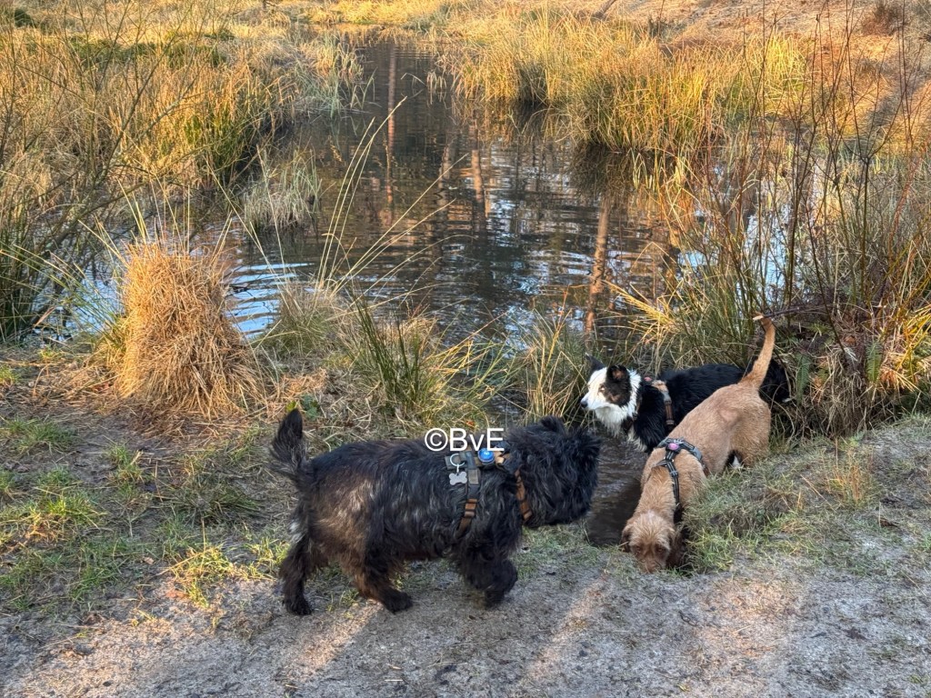 We hebben het geluk om aan het eind van de wandeling 3 stevige labradors te treffen en wat ander groot rasloos spul. De labradors zijn oudere reuen en Noor gedraagt zich voorbeeldig. Tuurlijk… Ze rent wel even een paar rondjes met ze mee en besluit mij dan te volgen. Moe worden zonder al te veel te bewegen. De labradors waren blijkbaar (wel) heel duidelijk naar Noor: doe rustig.