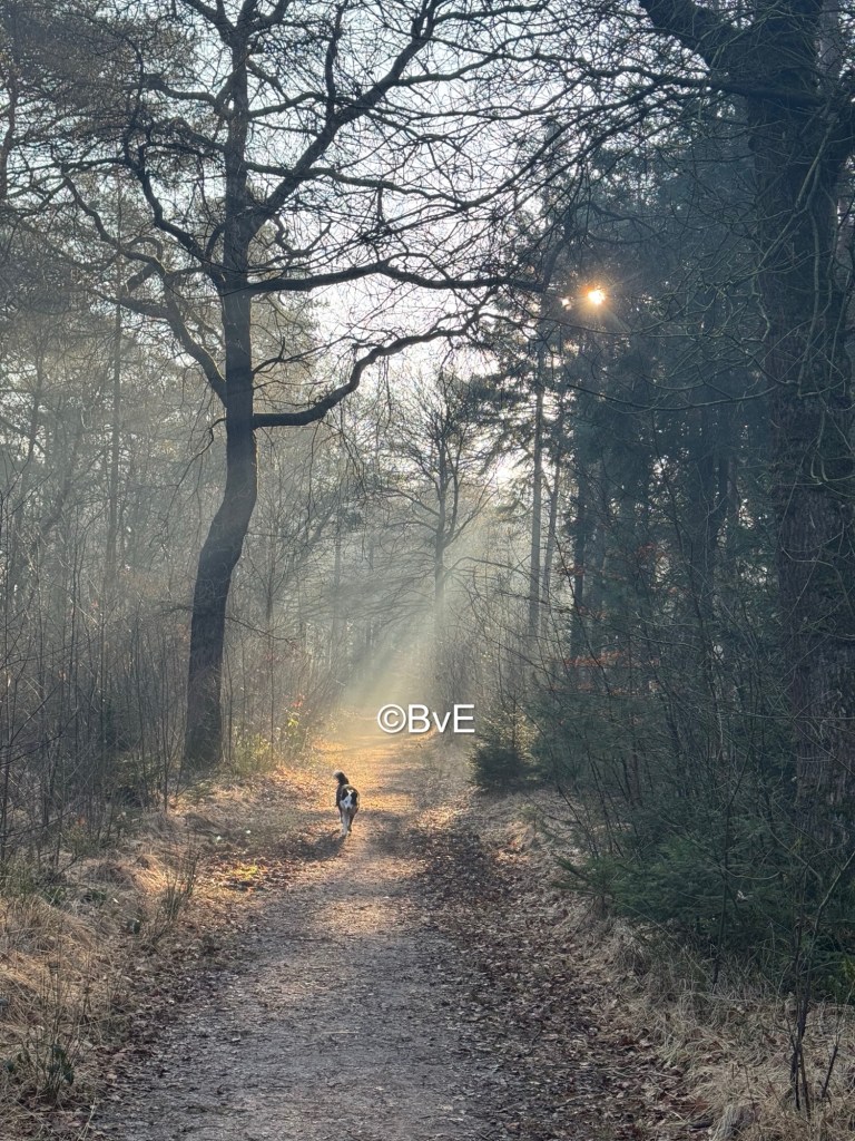 Een uurtje later dan gebruikelijk op boswandeling in de hoop wat andere honden te treffen, speciaal voor Noor. Ze speelt bij het loslopen zo ruig dat Amy het soms uitgilt van de pijn of gewoon omgelopen wordt. Klaar met dat wilde gedoe..Amy weet inmiddels dat ik haar veilige plek ben en gaat naast mij lopen als ze Noor helemaal zat is. En eerlijk gezegd ben ik het zelf ook wel spuugzat. Ook vanmorgen weer is ze minstens vijf keer aangelijnd in verband met irritant gedrag; daarna gaat het weer een tijdje goed. De hoop is nu om andere tanktypes als Noor tegen te komen zodat ze dit zelf ook even ervaart of haar energie even kwijt kan door ruw spel. De behoefte is er blijkbaar wel.
