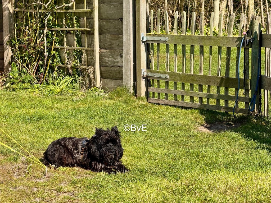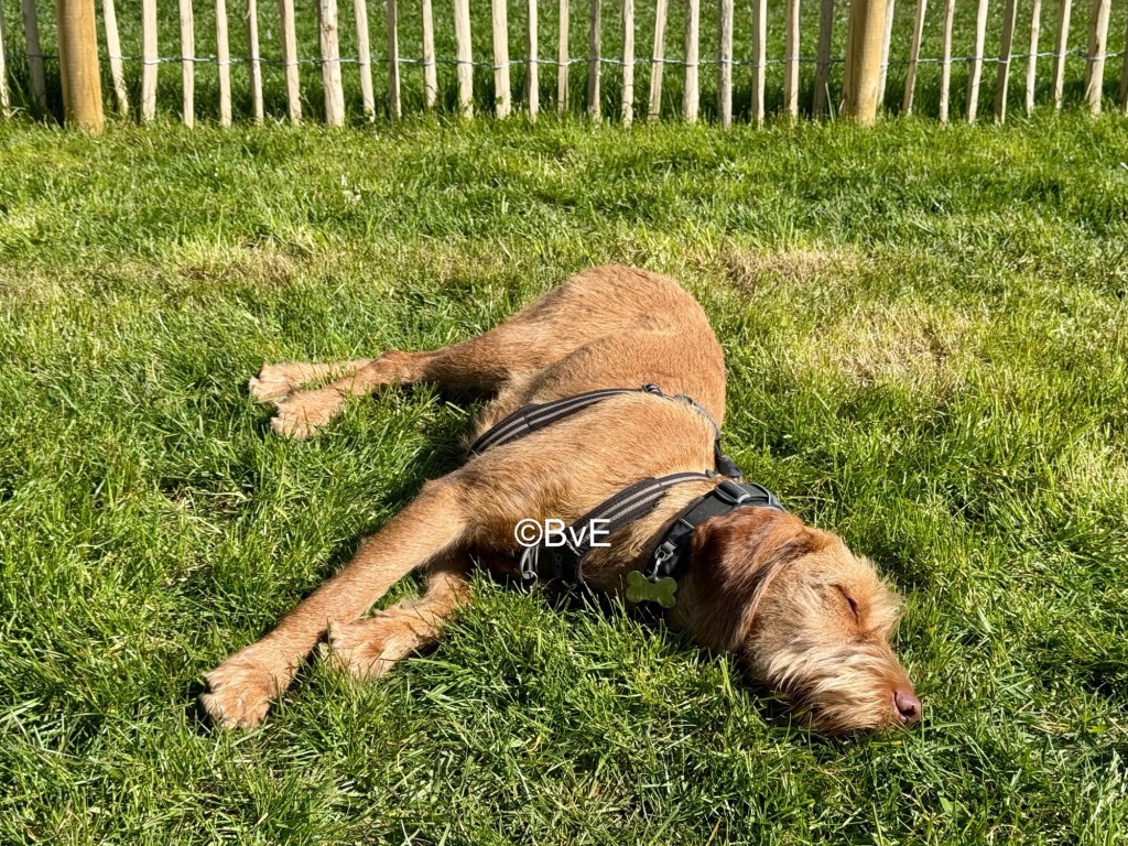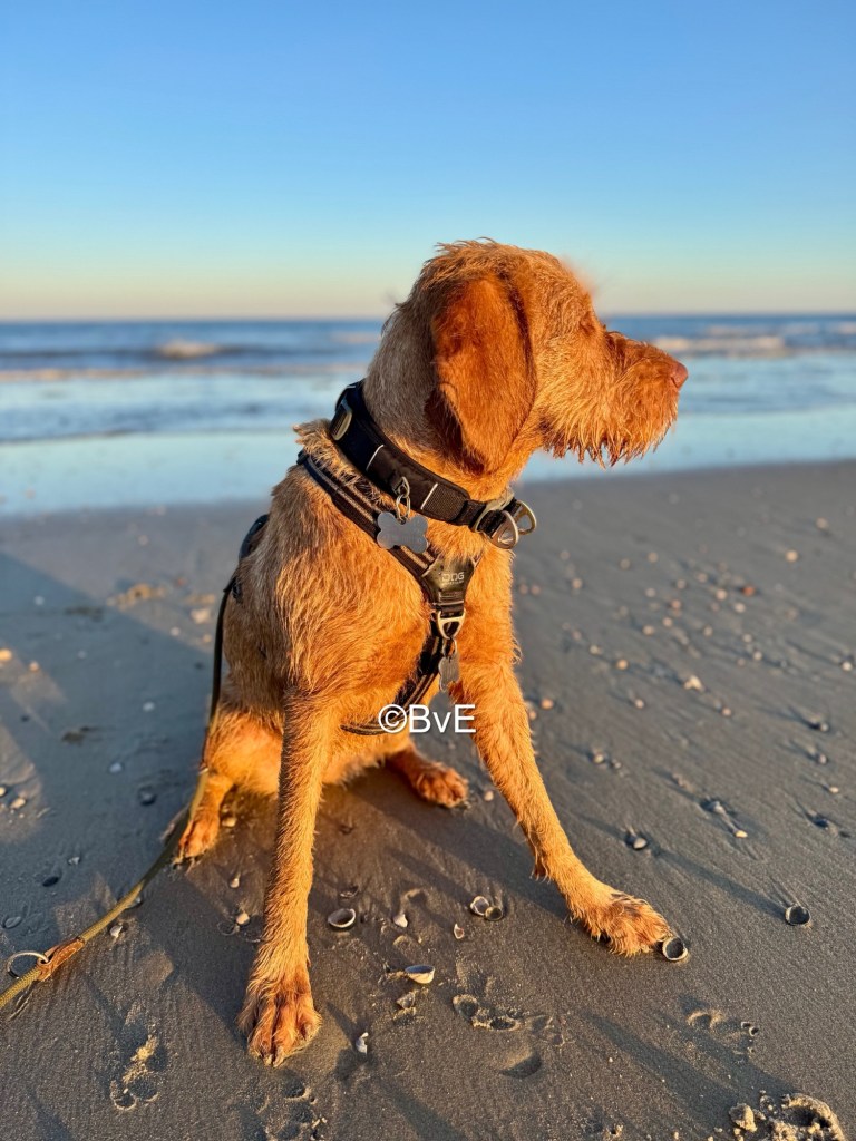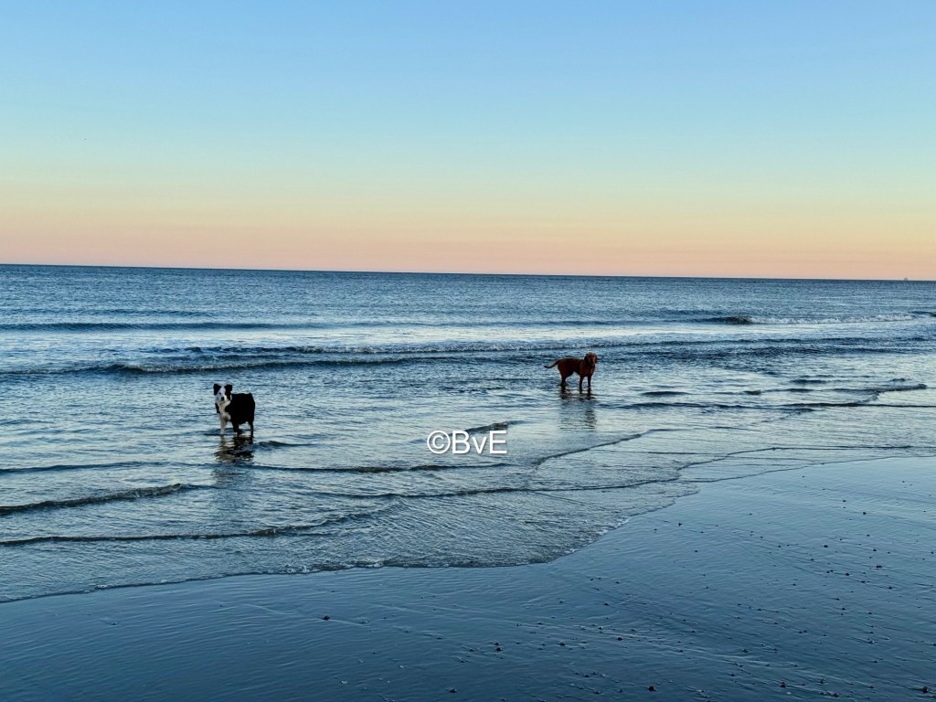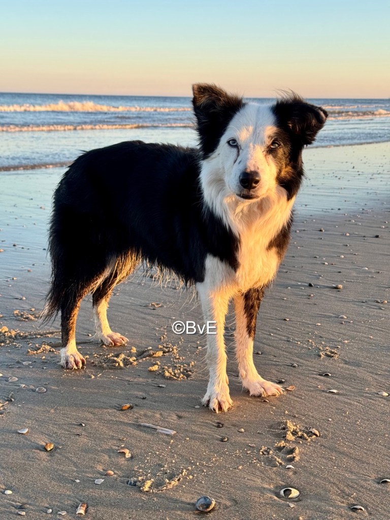 Om 6.30 wakker geworden en bij mijn eerste beweging gaat Noor al als een dolle in beweging. Dus maar snel aankleden en naar het strand waar ik geeneens de eerste ben. Hondjes lekker los en Noor blijft zich druk gedragen. Ze raced nog even ver van ons af achter een scholekster aan en na de zoveelste Amy-beukerij gaat Noor aan de riem. Na de wandeling lekker uitrusten op de camping tot na de middag. Noor ook maar even een half uur opgesloten voor de rust van ons allen; in de bench slaapt het namelijk wel heel goed. Maar even niet wachten tot die zoomies rond de picknicktafel en rond de tent fout gaan.