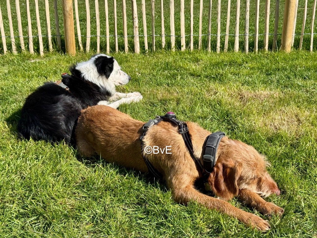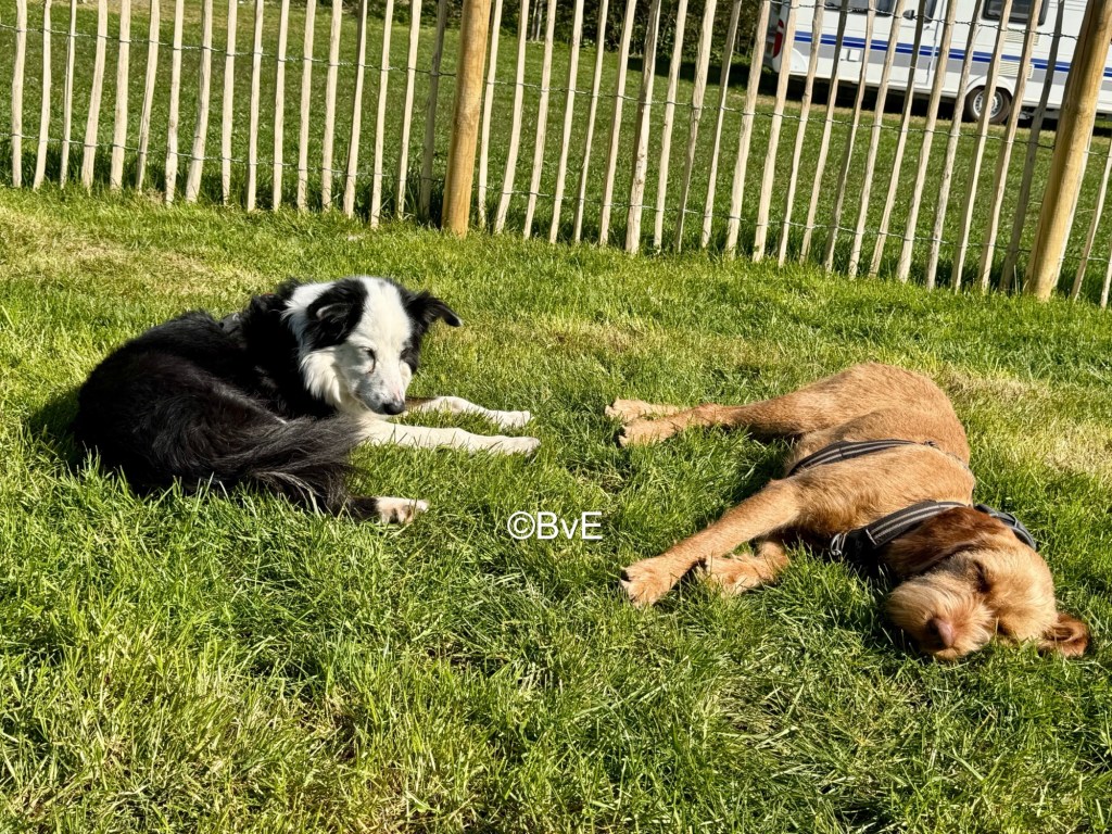 In de middag geheel uitgerust maar weer naar het strand. Vanwege de drukte Noor aan de lange lijn en dit bevalt mij zeer goed. Ze weet tot hoever ze kan gaan en de rust is heerlijk. Na een uurtje weer naar de camping en dan op rust met een kauwsnack. Dat was de bedoeling althans. Noor raced rondjes met snack in de bek en duikt er ook steeds spelend ruggelings bovenop. Als Amy haar snack op heeft gaat ze er wat van zeggen maar dan zie je dat ze ouder wordt: Noor loopt haar er compleet uit. Als het weer racen rond de tent wordt grijp ik in en zet ik Noor aan de lijn. Wat een energiebom.