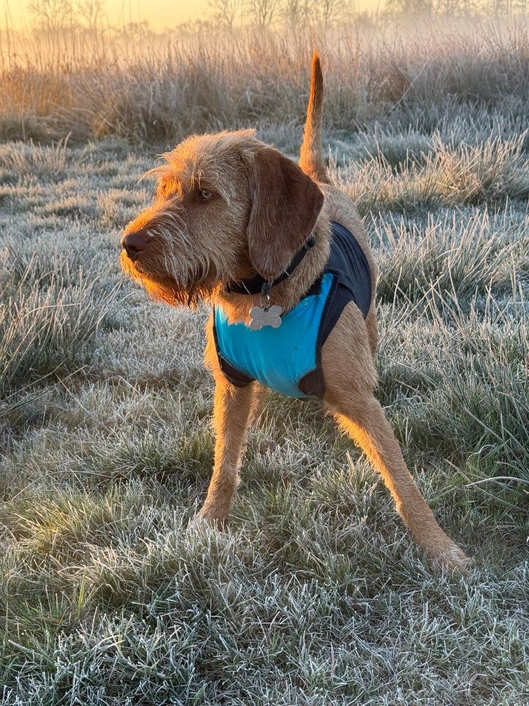 Noor heeft op haar zij twee plekken waar ze in geval van stress aan likt. Kamperen was stressvol vorige week dus de plekken zijn behoorlijk actief. Tijdens het kamperen dit opgelost door haar een t-shirt aan te trekken maar dat is geen handige oplossing. Vanmorgen dus bedacht dat de kap dan maar om moet. De grootste kap van zolder gehaald en een halsband in de juiste maat er in geprutst. Dan omdoen bij Noor…ze komt dan niet meer van haar plek en zit doodstil met haar kop omhoog. Dit houdt ze heel erg lang vol en zo kan ze zelfs wat doezelen. In de middag kon ik het niet langer aanzien en heb ik een oud operatieshirt van Noya opgezocht. Dit kledingstuk vind ze ook niet leuk maar ze beweegt wel weer. Na het slapen dan he? Want ze was in de middag zo moe dat ze aan één stuk door gepit heeft.