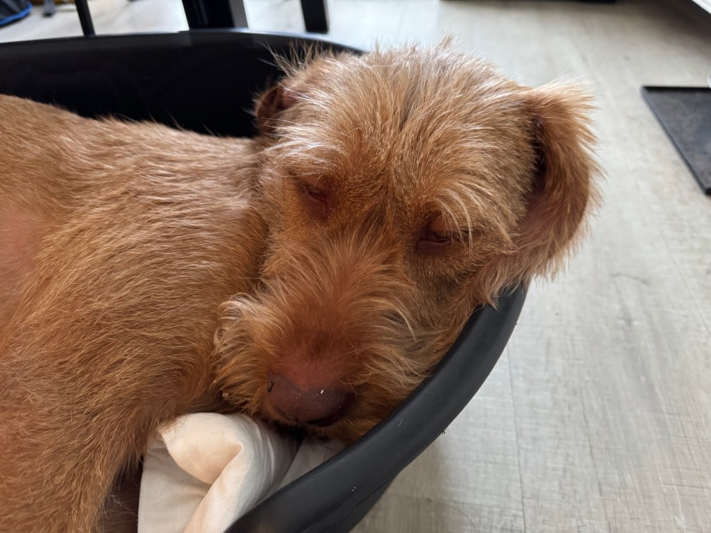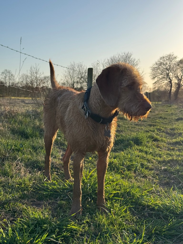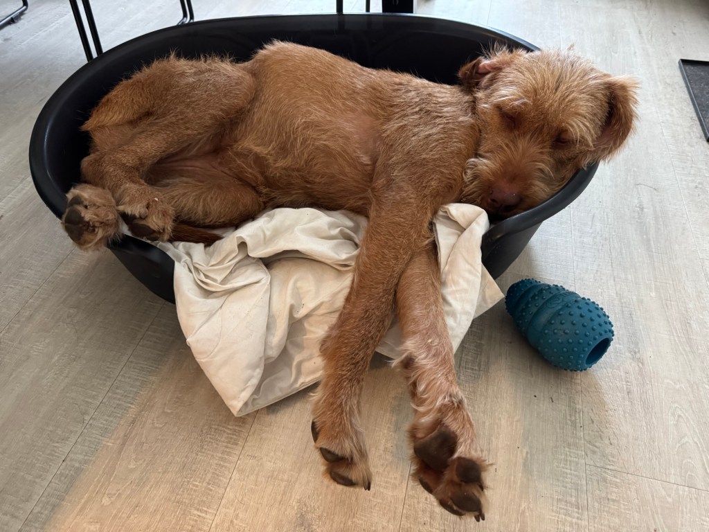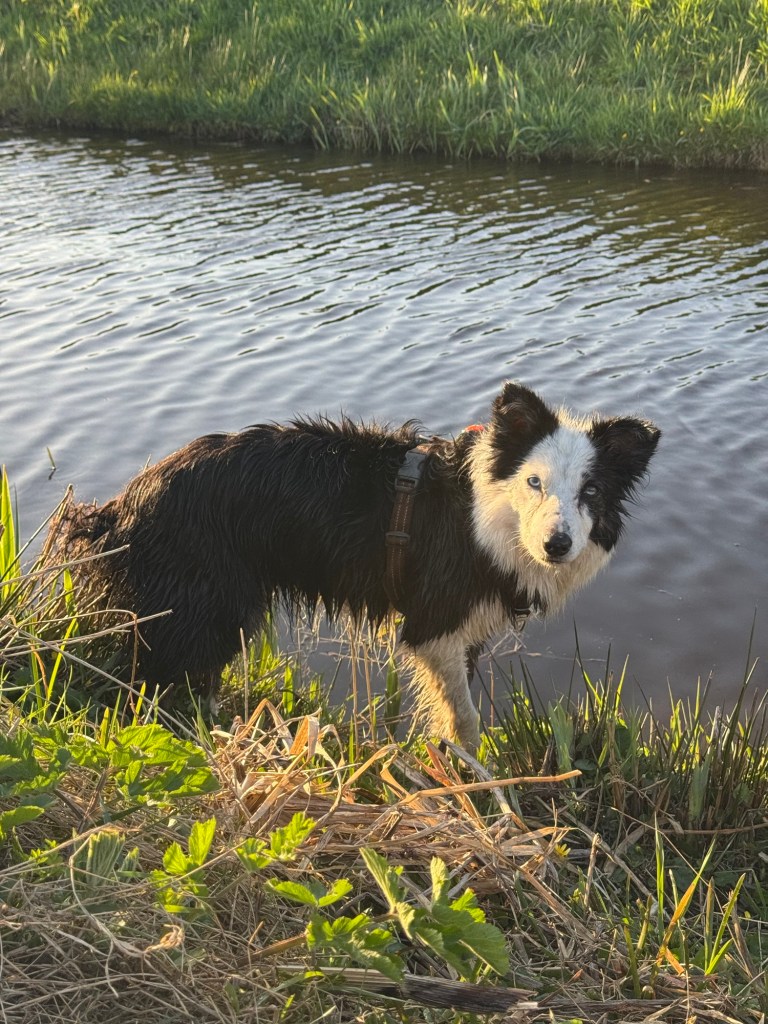 Naar huis voor een lange slaappauze en alleen nog in de benen voor de avondwandeling in het Sterrenbos. Bij de vaart sprong Amy er op een erg steil deel in voor een zwem en Noor vergiste zich in de afloop en stortte het water in. Paar plonsrondjes en dan de kant weer op proberen te komen. Licht paniek bij Noor omdat het niet lukte. Heel rustig gezegd dat ik haar zo kwam helpen en ik ben op mijn buik naar de kant geschoven om eerst Amy bij het tuig te pakken en er uit te helpen. Kon Noor mooi kijken hoe ik dit oplos. Vervolgens Noor bij de iets te ruime halsband vastpakken maar hij bleef om terwijl ik haar op de kant trok. En weer verder sjezen. Totaal niet onder de indruk gelukkig.