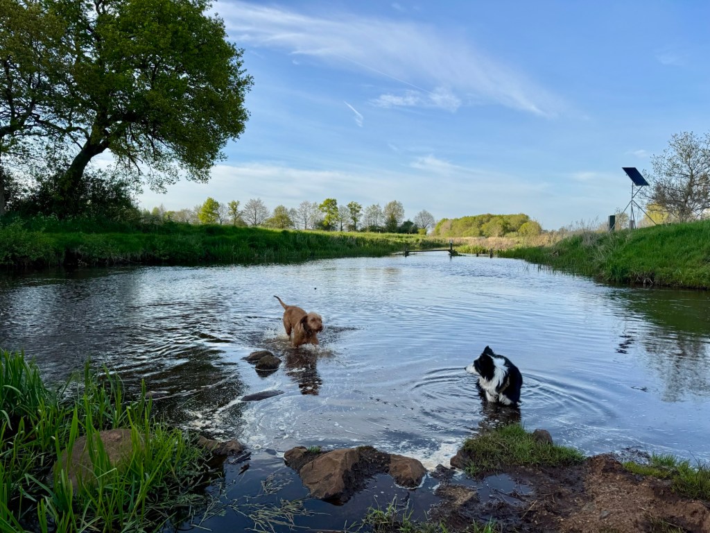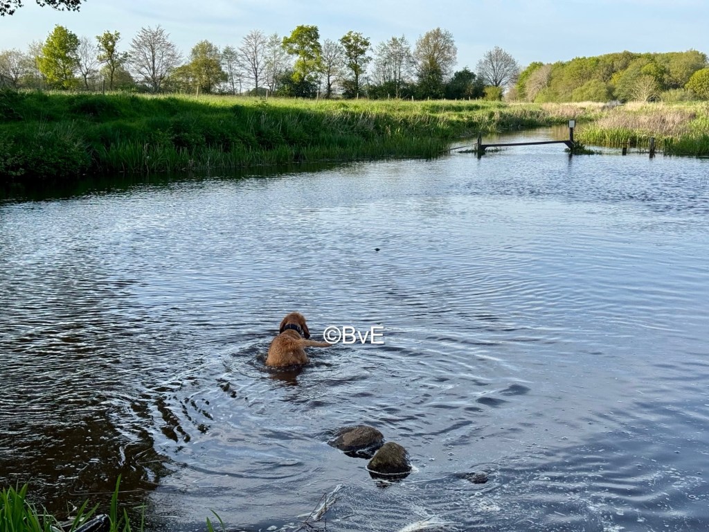 Voor het eerst de Loop in voor Noor. Smal bruggetje over met zichtbare diepte er onder. Heerlijk dat Noor in het midden van de brug blijft en geen behoefte heeft om over de rand te hangen a la Pippa. Er liggen veel keien in het water dus goede oefening in beheerst gedrag. Ze vind het stromende water dus echt geweldig leuk. Ik wist dus niet dat het daar zo ondiep was omdat Amy hier altijd zwemt….