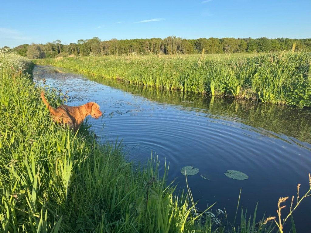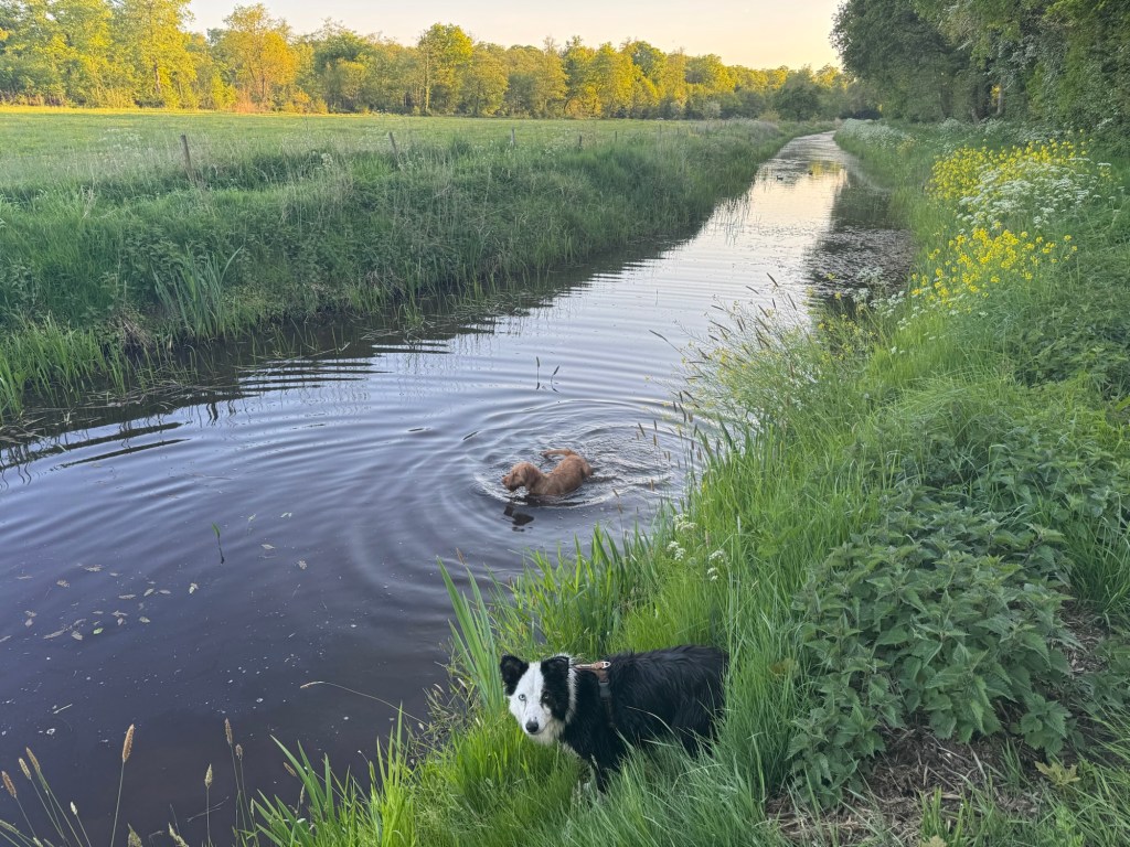 Genoten van onze avondwandeling in de Mensinghe. Noor kreeg door dat het water in de sloot helemaal niet diep is en was steeds in het water te vinden. Amy heeft lekker meerdere gezwommen. Zo gaan we lekker moe het weekend in..