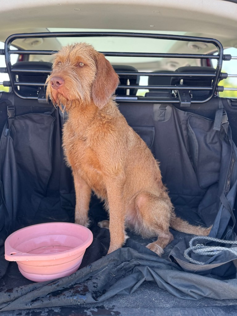 Met Noor vanmorgen naar de jachttraining in Drachten geweest. M vroeg gelijk of we een vachtje mee hadden. Gelukkig had ik mijn konijndummy nog in mijn vest zitten. Er voor gekozen om Noor te laten kijken naar de vallende dummy en vervolgens aan de andere kant van het veld haar uitgestuurd op zoek. Omdat er ook een canvas dummy gegooid was, ging ik er eigenlijk vanuit dat ze daar mee terug zou komen. Ze heeft thuis liever canvas dan vacht namelijk. Maar tot mijn grote verbazing schoot ze heel gericht door het veld om terug te komen met ons vachtje. Ze was ongelooflijk tevreden met zichzelf en liep ook even een blij rondje om M die haar ook al net zoals ik de hemel in prees. Dikke worstbeloning er in en in de schaduw wachten tot de rest klaar was.