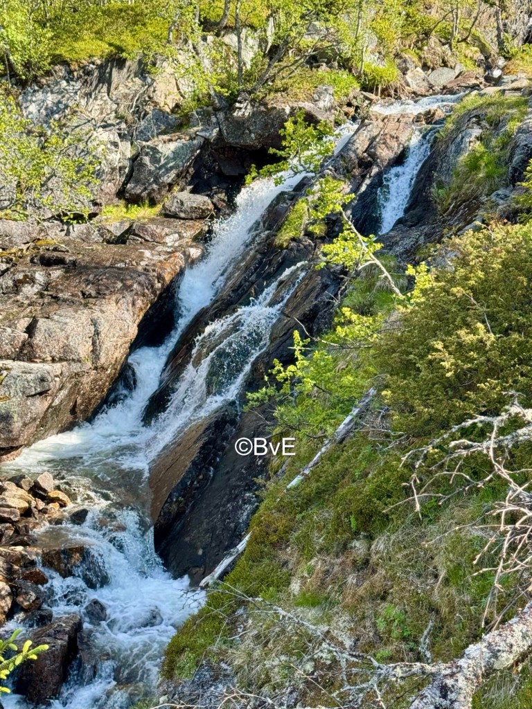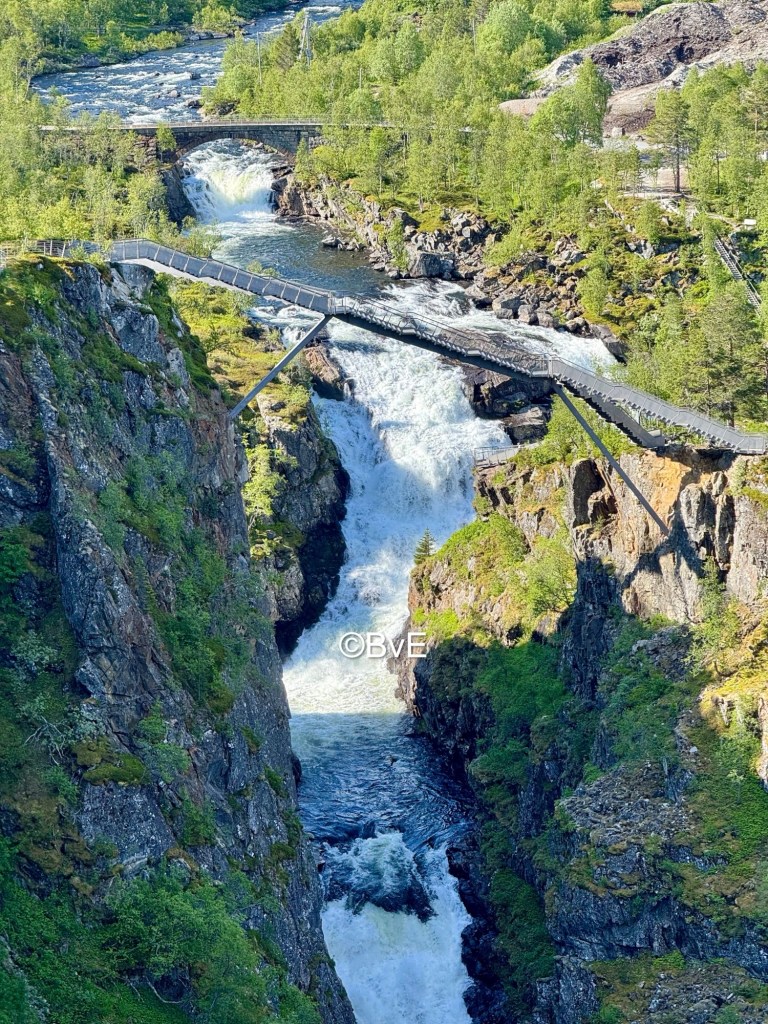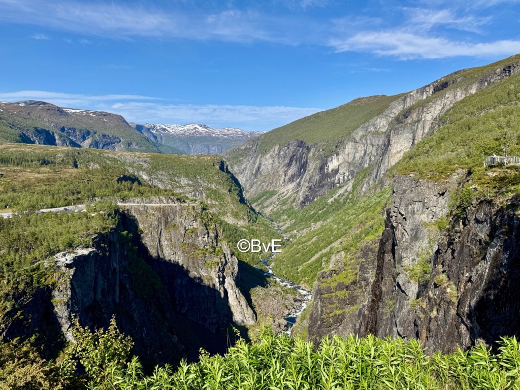 Lekker op tijd op pad om een poging tot een wandelroute te doen. De weg (single track) naar de wandelparkeerplaats staat echter gemarkeerd als gevaarlijk en het staat er ook nog es in drie talen. In al die jaren in Noorwegen nog nooit gewaarschuwd voor een gevaarlijke weg dus ik besluit ter plekke om dan ook niet te gaan. Dan maar weer met de auto de Hardangervidda in. Eerst maar naar Voringvossen. Deze keer de route naar het hotel bij de watervallen.