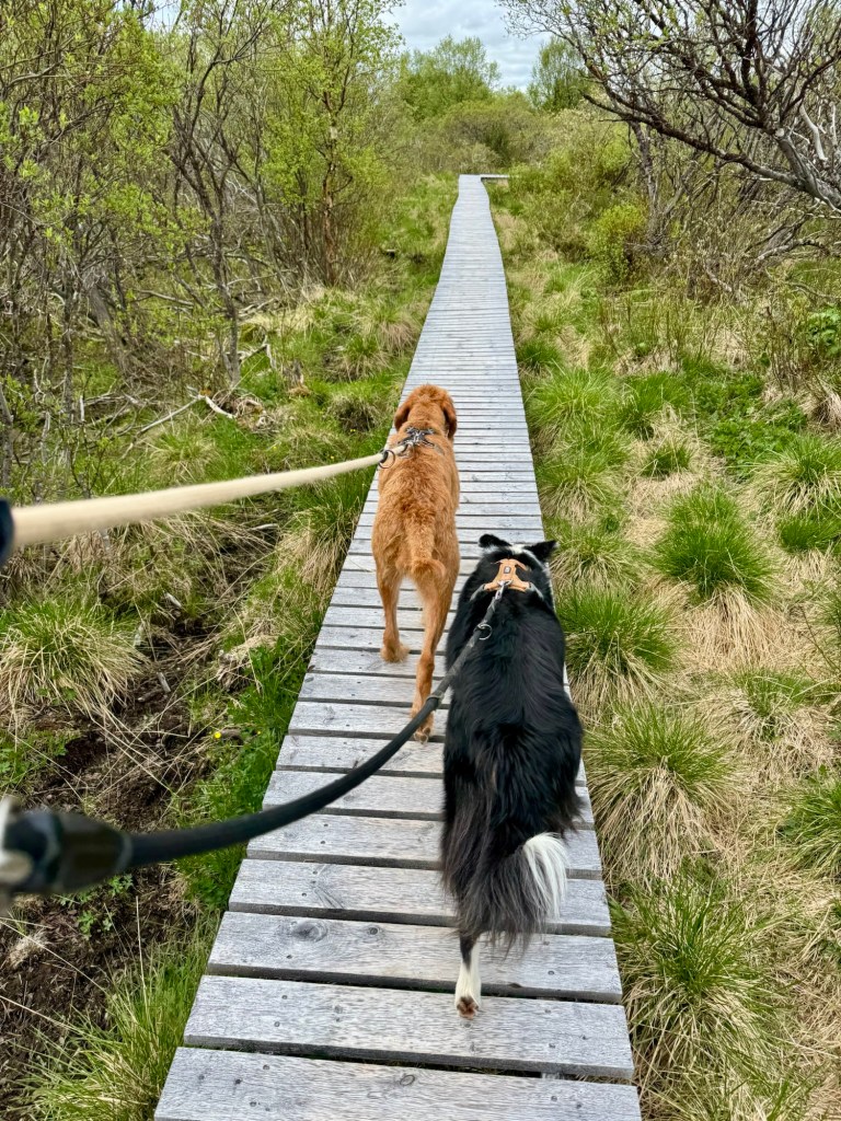 Meer dan 1,5 kilometer lang plankenbruggetjes. Amy lijkt haar bruggetjesangst onderweg volledig kwijtgeraakt te zijn. Noor sprong er af en toe naast uit eigen initiatief en kwam er dan achter dat ze in de blubber kwam. Leer je ook van zal ik maar zeggen. Hier fijn gewandeld en daarna naar Dombas gereden omdat dat vlakbij was. Hoop mensen en weinig vertier dus niet zo lang gebleven. Terug naar de camping voor een late lunch en een rustpauze. Noor opgesloten in de bench omdat ze maar bleef knagen op van alles uit onze tijdelijke voortuin. In de bench is ze ook zo in slaap.