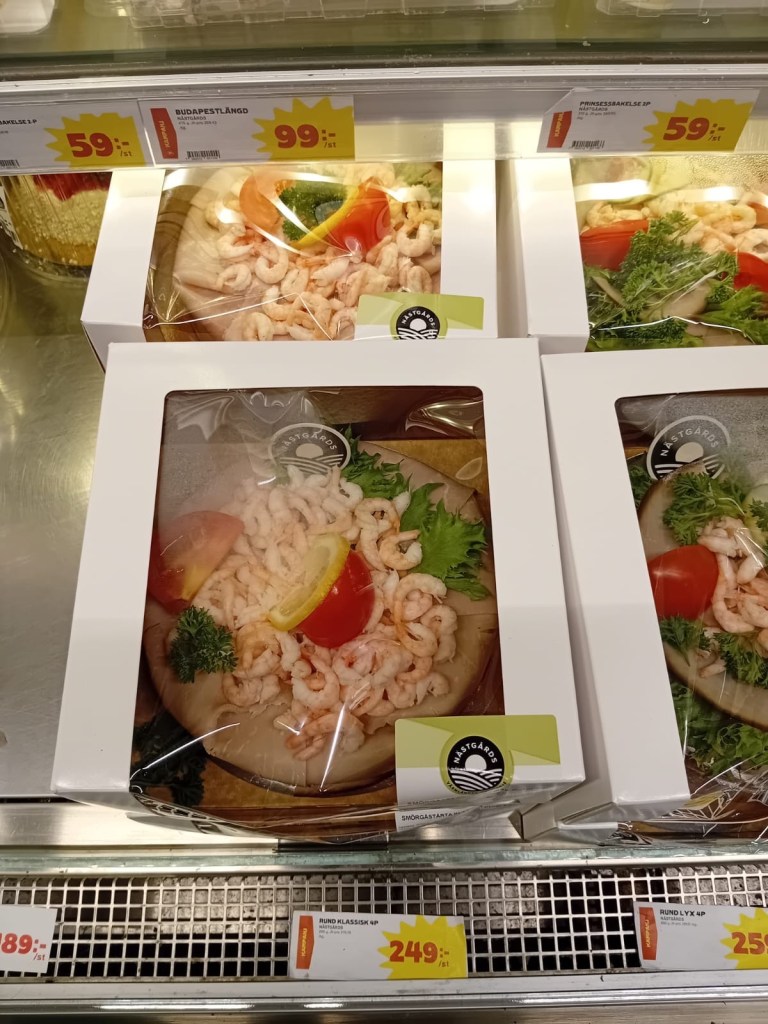 Voor mijn verjaardag wel een gebakje verdiend vond ik. Aan de speur in mooie grote supermarkt in Arvik. Ligt dit in het gebakvak: