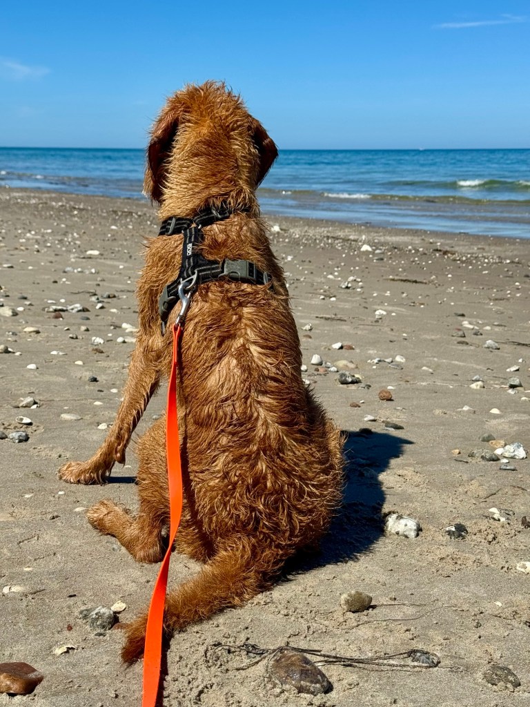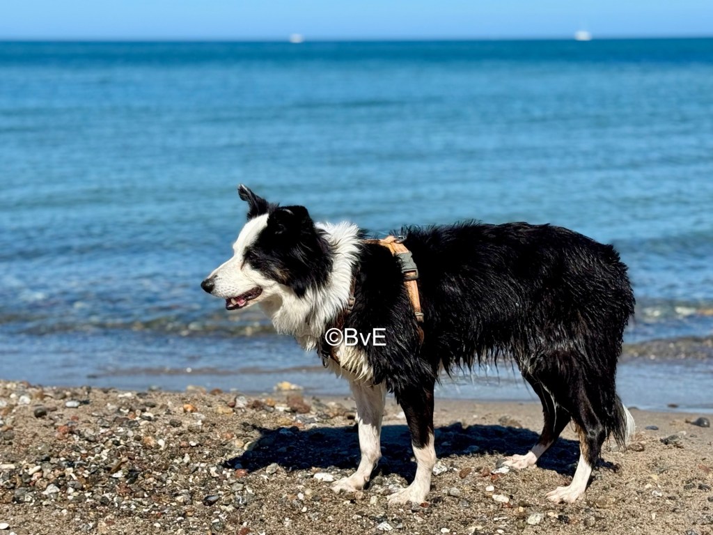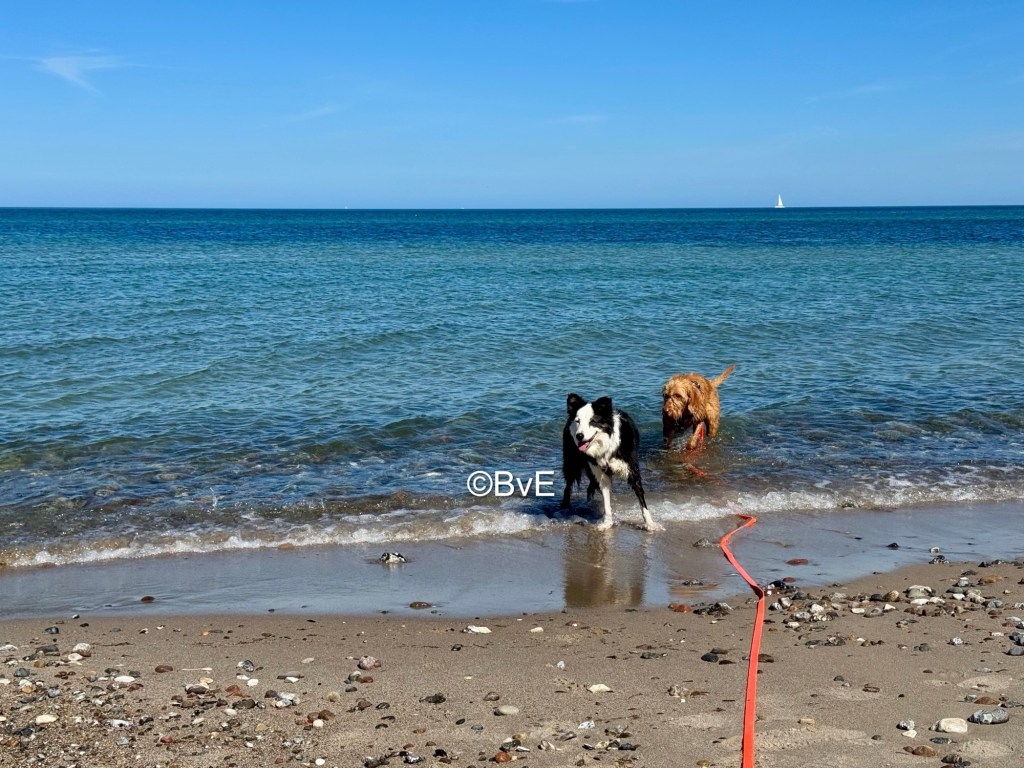 In verband met de weersvoorspelling gekozen voor een stranddagje in Liseleje. Deze plaats heeft een groot bos en een groot deel zandstrand (in plaats van stenenstrand). Vanaf de parkeerplaats gelijk het bos in gedoken en binnen 5 minuten de eerste hond al bij ons. Gezellig, maar zijn bazinnetje op een naastgelegen pad, miste hem totaal niet omdat ze heel druk aan de telefoon was. Dan begint na een paar meter het vergeefse roepen en als ik in het Engels aangeef dat hij bij ons is, haalt ze hem, nog steeds druk bellend, op. Wij lopen door en dan staat er een soortgelijke hond midden op het pad en die grauwt Noor af die voor haar doen rustig aan komt lopen. Noor boeit dat zelf schijnbaar niets maar ik berisp de kattenkop in het Nederlands. Dan duikt onze beller weer op: deze hond is ook van haar….