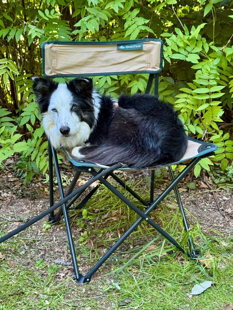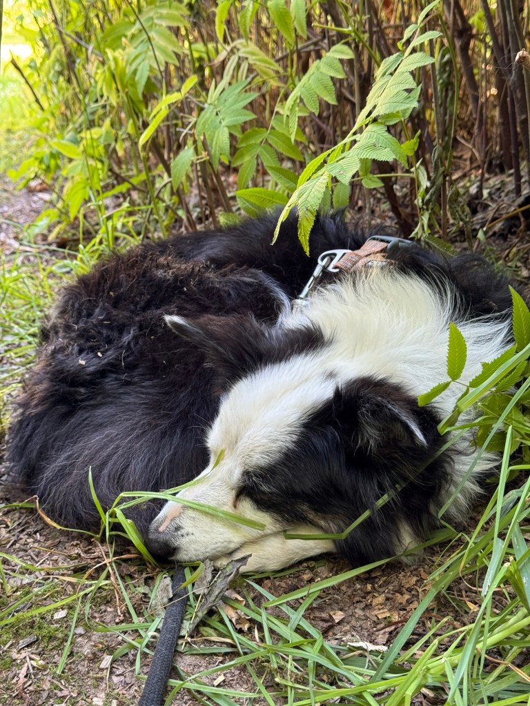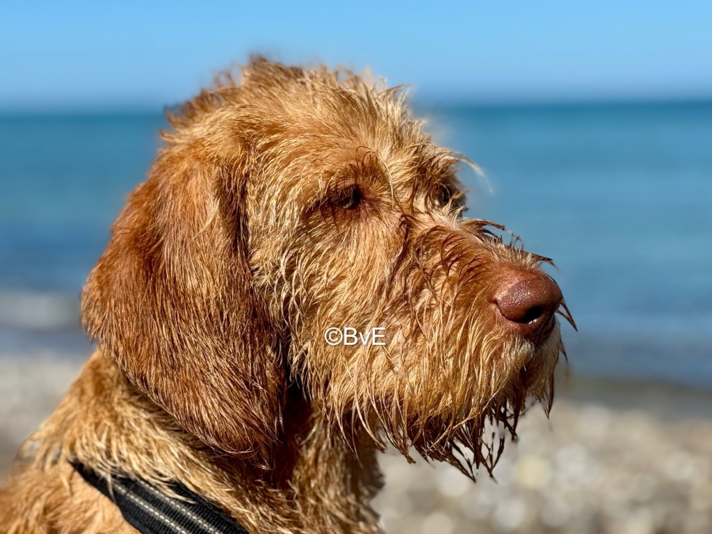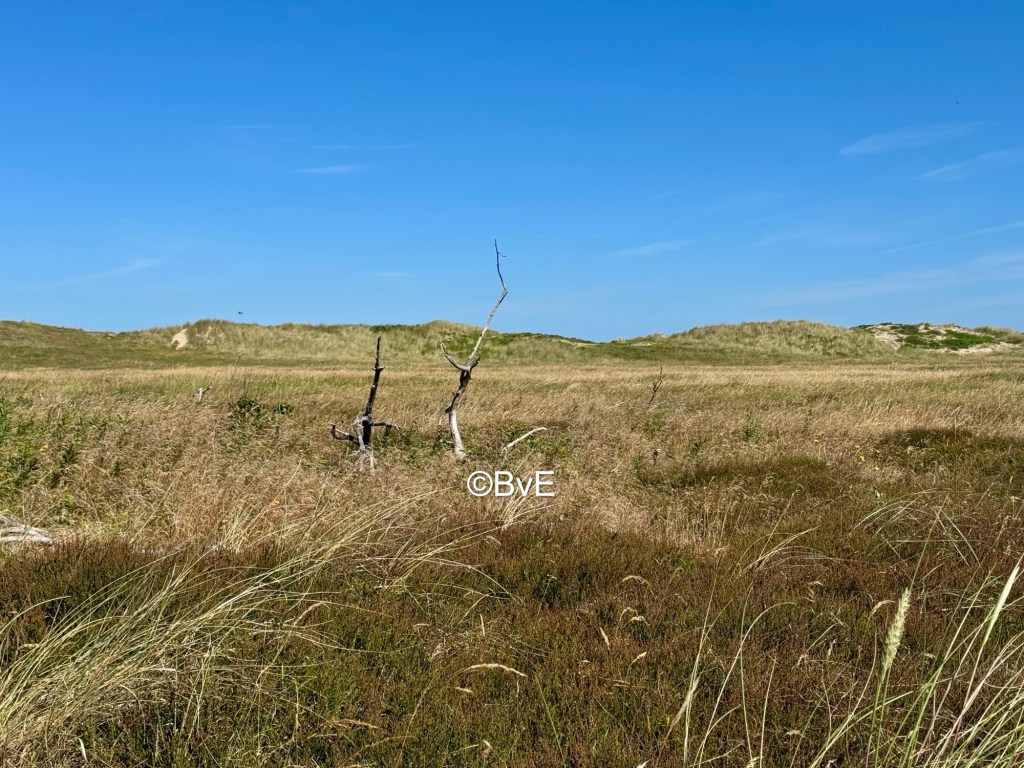 Stukje verder sjokt een beetje alternatief figuur: blauw in d’r haar, wat vreemde kledingkeuze en veel zichtbare tatoeages. Achter haar een licht mankend zwart poedeltje. Noor dondert er net niet bruut overheen. Ik zeg tegen Noor dat ze voorzichtig moet doen en het hondje krijgt dan ineens de geest en dartelt met Amy en Noor mee. Als we mevrouw een paar meter voorbij zijn, zegt ze ineens in het Engels dat hij bijna 15 is. We raken aan de praat en Louis de poedel vind het reuzegezellig tussen de dames. Hij trippelt actief tussen beide dames heen en weer. We hebben het over de lange lijn van Noor en mevrouw geeft mij aan dat dat heel verstandig is in verband met a lot of Bambi’s in dit bos. Ook blijken er wilde zwijnen rond te sjouwen maar die doen niets volgens haar. Snuffelen altijd heel lief aan haar hondje…. Samen het bos door gewandeld tot de duinenrij in zicht kwam. Zij ging weer terug met het oude mannetje en wij nemen het pad door duingebied. Ik krijg nog heel lief mee dat ik voorzichtig moet doen in verband met de warmte.