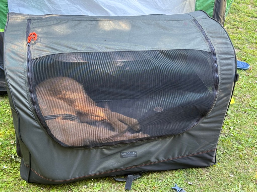 Kort stukje door warm duingebied en dan een duin over en de zee in. Wat een heerlijkheid. Plekje waar het heel ondiep is en daar zelf ook het water in gegaan. Veel zwemmende kwallen dus uitkijken voor drie. Noor en Amy beiden aan het zwemmen! Met tussenpauzen uitrusten op het strand en dan halverwege de middag maar retour camping.