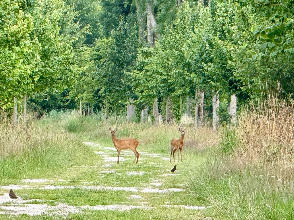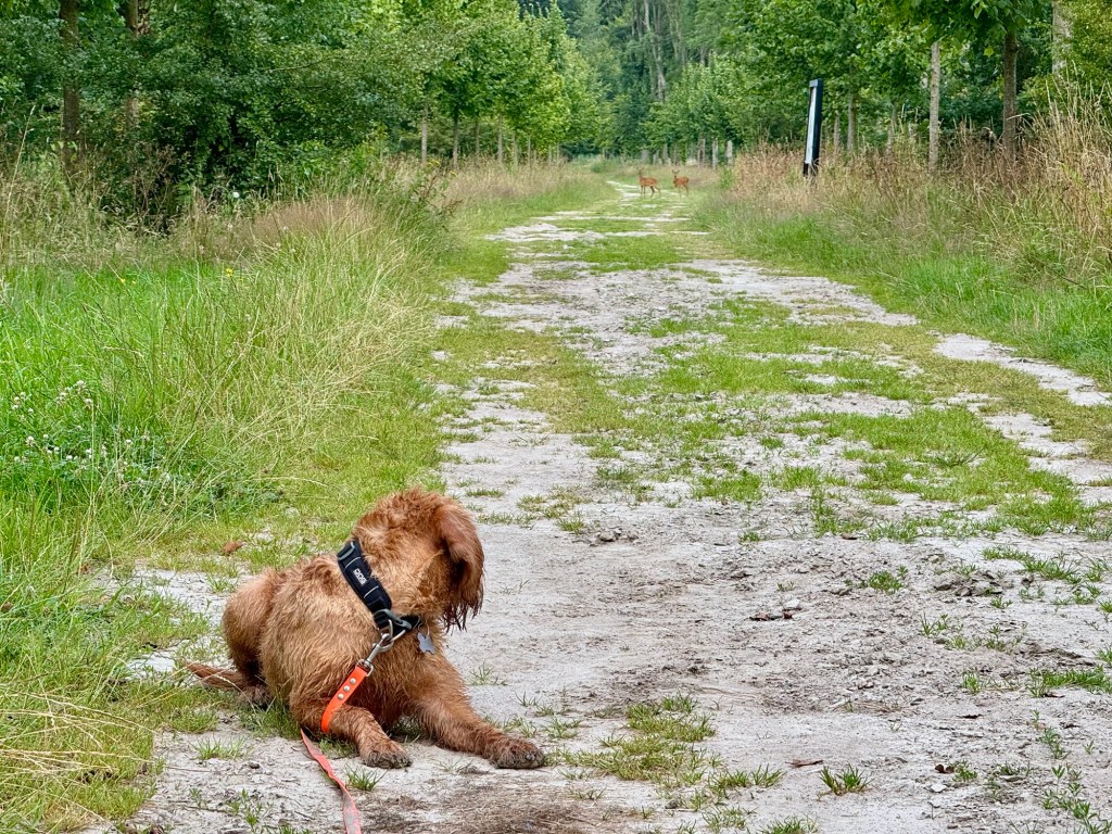 Dan door het park weer verder en twee jonge reeën treffen op het pad. Ze weten niet echt wat te doen: blijven of weggaan, links of toch maar rechts… Omdat ze zo dralen ben ik maar op het pad gaan zitten kijken. Ze ruiken ons niet en als we stil zitten, zien ze ons op een gegeven moment niet meer. Tijdje zo gezeten tot ze voor een andere wandelaar uiteindelijk op de loop gingen.
