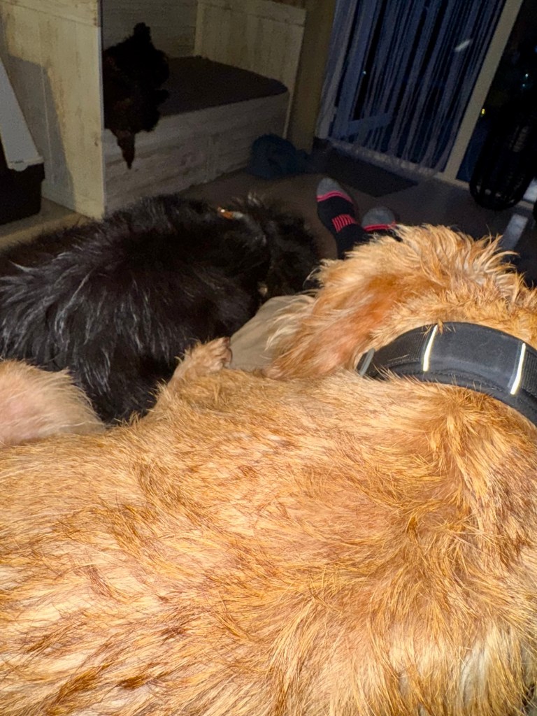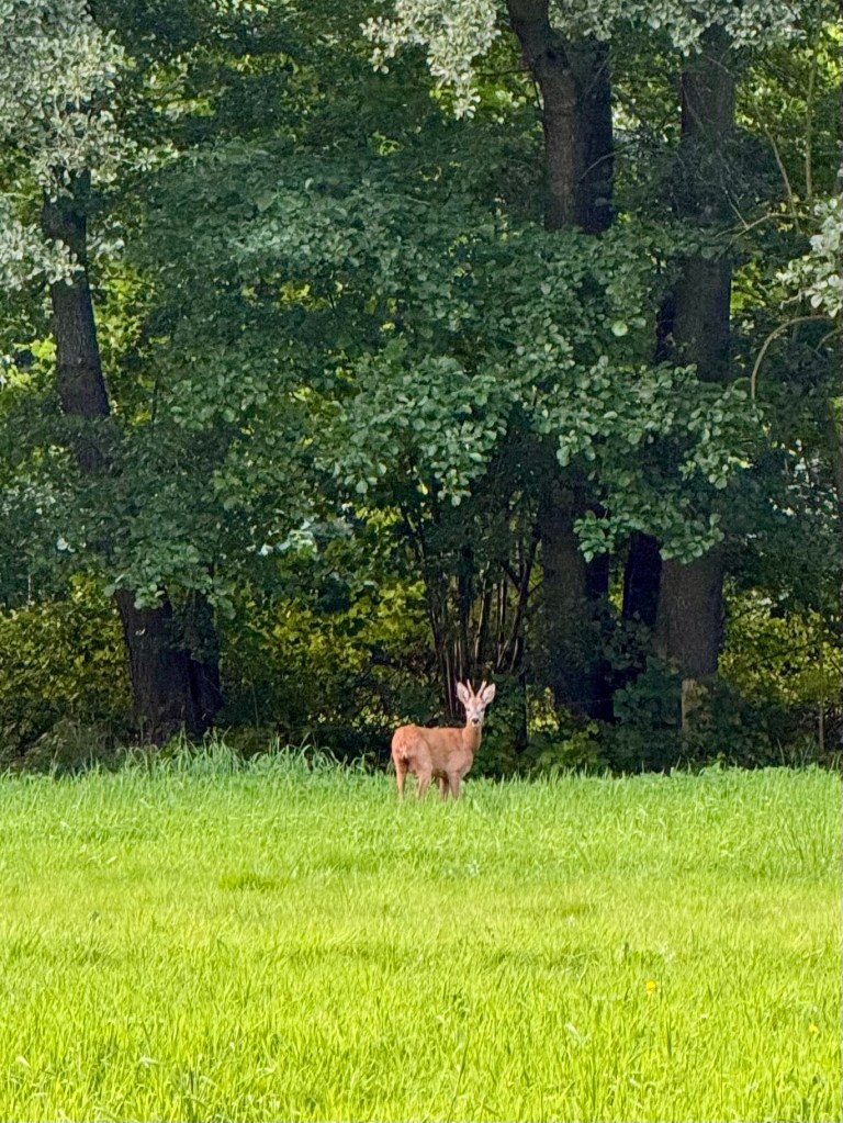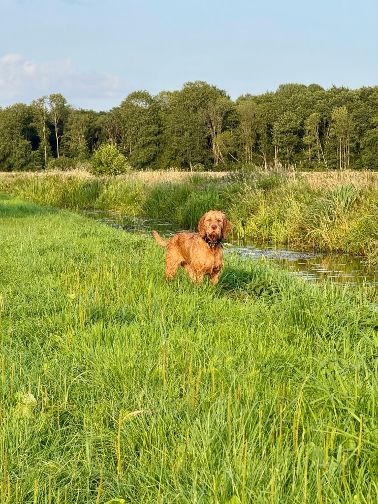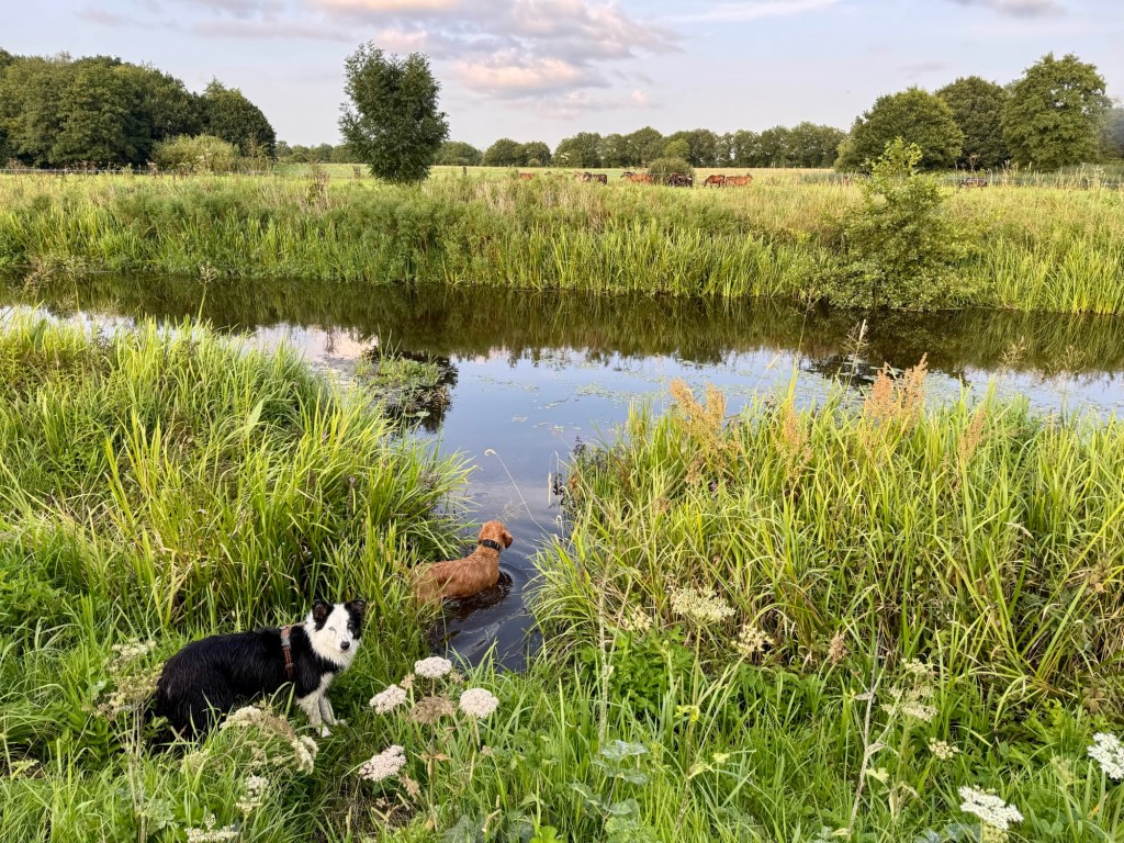 De route was weer mooi en aan het eind troffen we een ree in het land. Noor had die al even in de neus dus ik had haar gelukkig tijdig aangelijnd. Rebel speelde weer es voor held: een meneer stond in de houtwal verdekt opgesteld foto’s te maken van de reebok in het land. Toen Rebel deze man in het vizier kreeg sprong hij woest naar voren! Het maakt hem dan echt niet meer uit dat je zegt dat het ok is. Gelukkig heeft hij een tuig om… en nadat ik een praatje maak met meneer wordt ie wel weer kalm. En als ie dan zelf weer verder mag lopen loopt ie ook uitermate macho achter je aan: breed gemaakt en supertraag. Dat het meneer wel even heel duidelijk is dat hij nog steeds alert is. Waarvan akte.