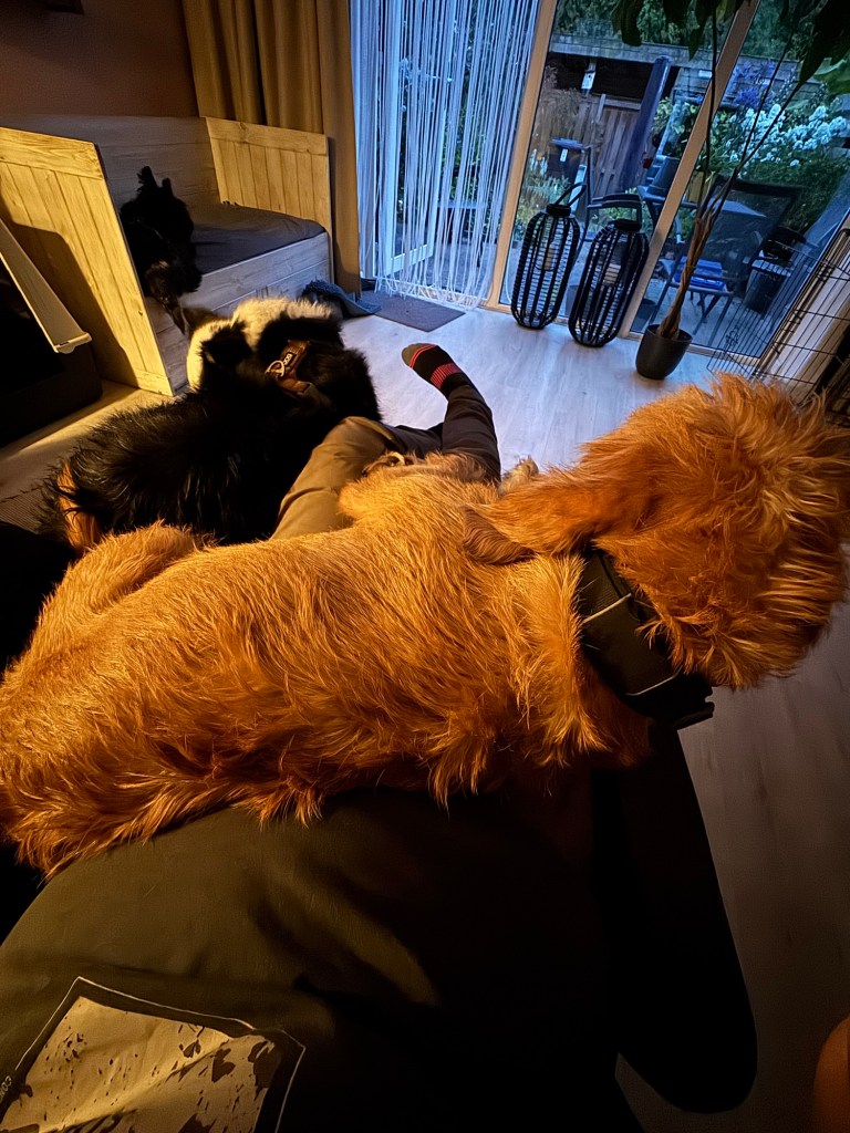 Bij thuiskomst een avondje in de luie stoel met twee dames.
