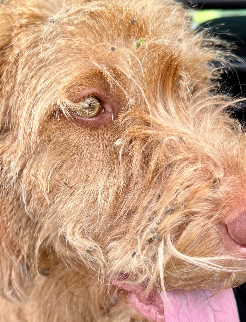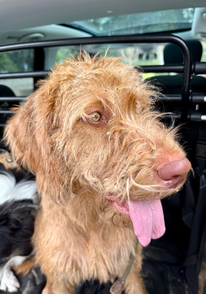 Komen we terug bij de auto en zie ik die kop van Noor: onder de grasbolletjes! Wat een klus om dit te verwijderen! Dit nog nooit meegemaakt bij een hond. Ik ben maar op straat gaan zitten met de kofferbak als werkruimte maar wat een crime. Met name de lippen en oorflappen zaten vol en da’s vrij gevoelig om daar in die haren te wroeten. Gelukkig bleef Noor rustig en vriendelijk.
