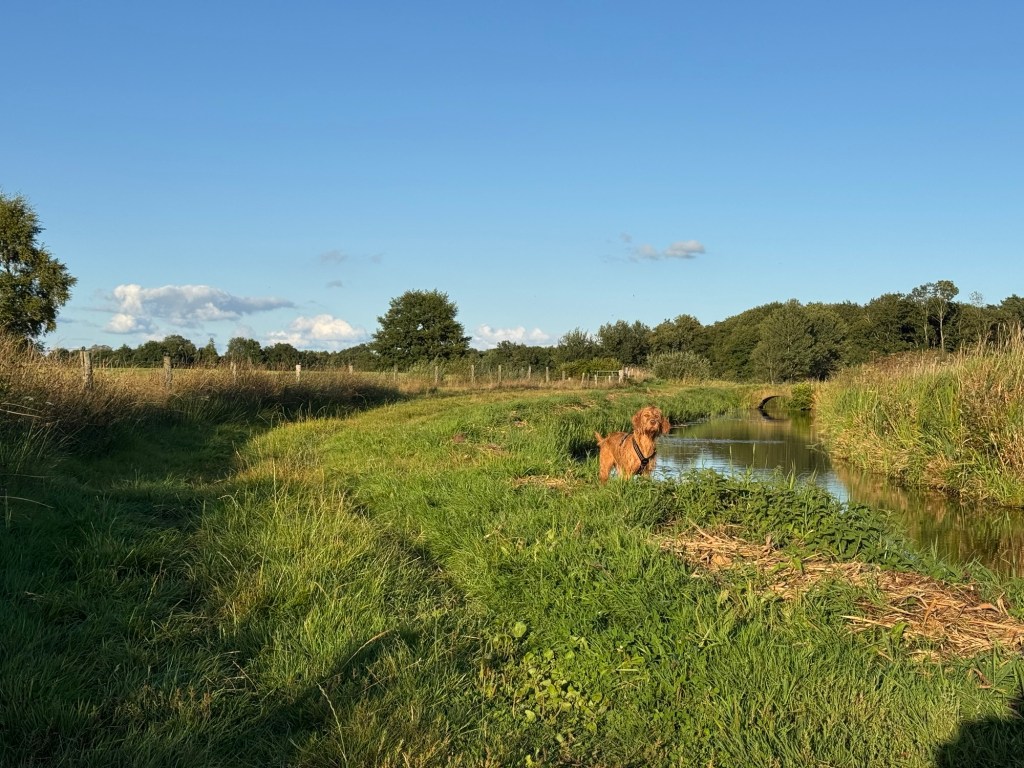 Noor het water ingestuurd voor een blind apport. Er lagen namelijk meerdere ballen in de sloot en er lag ook een mooie gekleurde bij. Die tennisballen hoef ik niet maar zo’n luxere bal is altijd welkom. Ik stuur Noor vooruit en ze zou me zo een dooie rat pakken die in het water dreef . Gruwel!! Teruggeroepen en weer naast me neergezet, vooruit aangegeven en nu gewacht tot ik haar blik over de rat heen de juiste kant op zag gaan. Ze gaat het water in en de juiste richting en als ik zoek fluit heeft ze snel de bal te pakken. Ze komt blij terug en ik wil de bal het water weer ingooien als haalbeloning voor haar, als ik nog een dooie rat zie drijven. Dat is me één te veel. Dan maar een koekje voor haar als beloning en weg hier.
