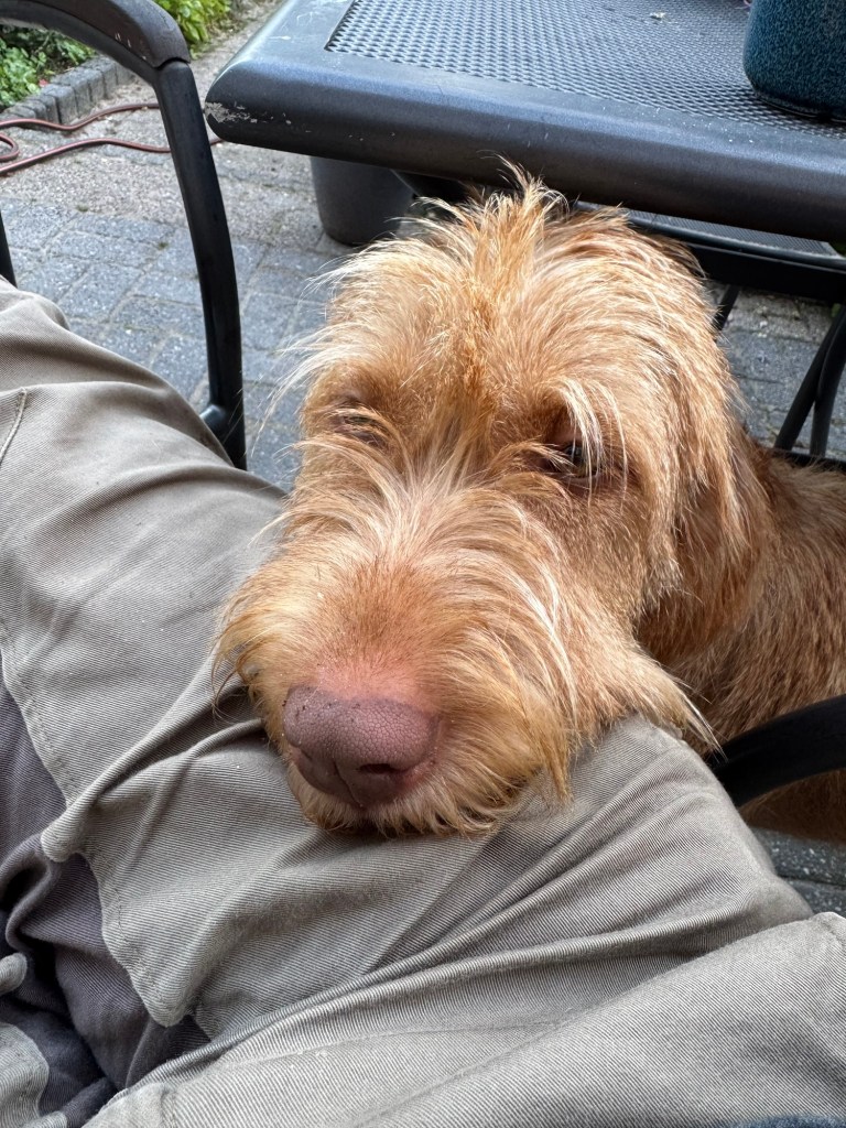 Tegen lunchtijd was ze weer wat minder fit maar een kwart van haar voer ging er toch mooi in. In de namiddag werd ze wat hijgerig en gaf de thermometer iets verhoging aan. Maar ja, ook net naar veldje gelopen in de zon dus of dat zo’n goede graadmeter is. Haar maar lekker gelaten maar wel de deur naar de gang open gezet. Vanmorgen deed ik namelijk de deur onverwachts open, lag ze er voor en kwam haar poot er onder. Oeps. Nog even kreupel ook.