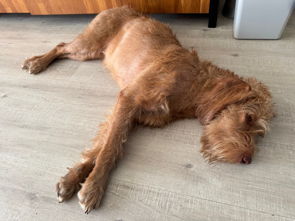 Vervolgens nog een dummy van over een sloot ophalen. M gaf aan dat ze in het water zwemmend de verwaaiing al oppakte. Da’s mooi!