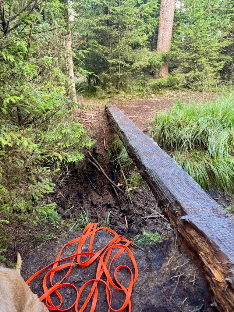 Ik ben gewoon in de sloot gaan staan; Noor op zit tot Rebel en Amy aan de overkant waren en dan Noor insturen. Vervolgens pak ik de brug beet om me op te hijsen uit de sloot en denkt Rebel dat dit als aanmoediging voor hem bedoeld is om de kattenloop (agility) es te doen. Die hobbelt braaf de balk op om op mij Nee! ook weer om te keren. Gruwel. Weer verder door een bosperceel met veel omgevallen bomen waarop ik per boom aangeef wat ze moeten doen: onderdoor of overheen. Rebel heeft bij er overheen iets hulp nodig omdat hij gemakkelijk wegglijdt op het groen. Maar zonder kleerscheuren weer bij de auto en gelukkig geen wolven gespot onderweg.