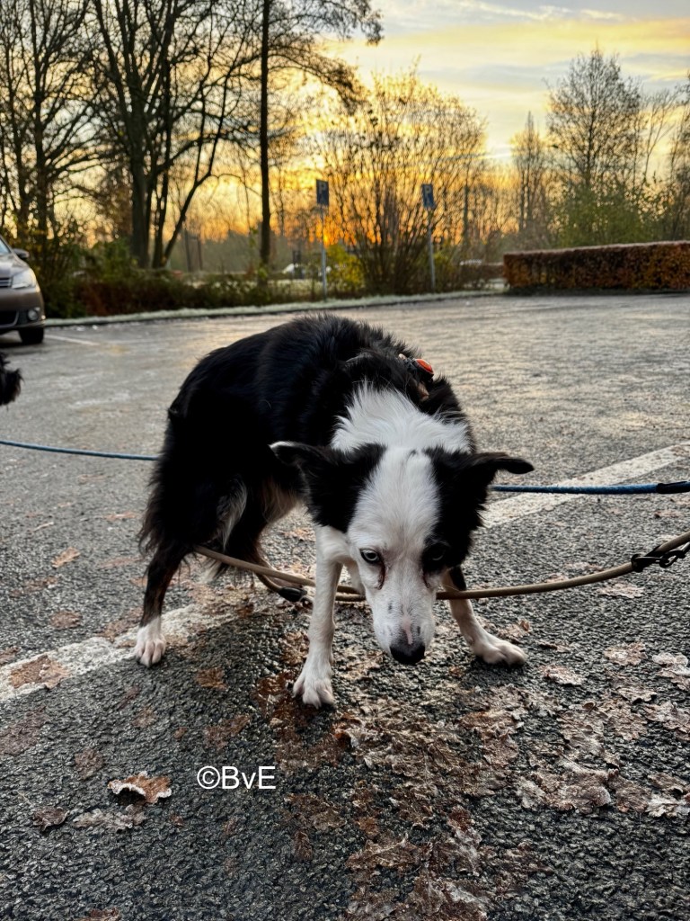 De dag gestart met rondje Nienoord. Spiegelglad op de parkeerplaats en dat ziet Amy dan aan mijn lopen. Gevolg: ze durft geen stap meer te verzetten….