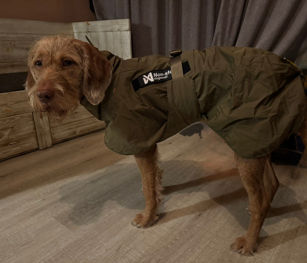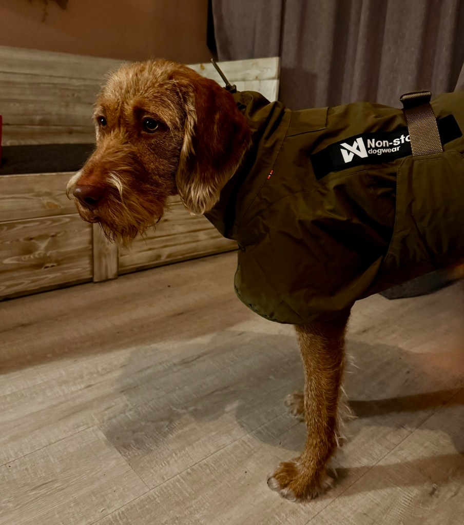 Dan ’s avonds toch maar aan het inlezen voor een goede jas voor Noor. Gestart met Hurtta omdat ik die altijd prima vond maar in afgelopen jaren is er wel het een en ander veranderd op jasgebied. Uiteindelijk een mooie jas gevonden van Non-stop : wind en waterdicht en bedoeld voor werkhonden (met veel bewegingsvrijheid en kan tegen een stootje). Genoteerd als toekomstige aanschaf en vervolgens besloten online te gaan winkelen bij mijn favoriete jachthondenshop voor een paar extra dummy’s. En je weet hoe het dan gaat: je oog valt ineens op hondenkleding. Kleding? Hebben ze ook hondenkleding? En dan zijn ze ook nog es in de aanbieding. Keuze snel gemaakt 🙂