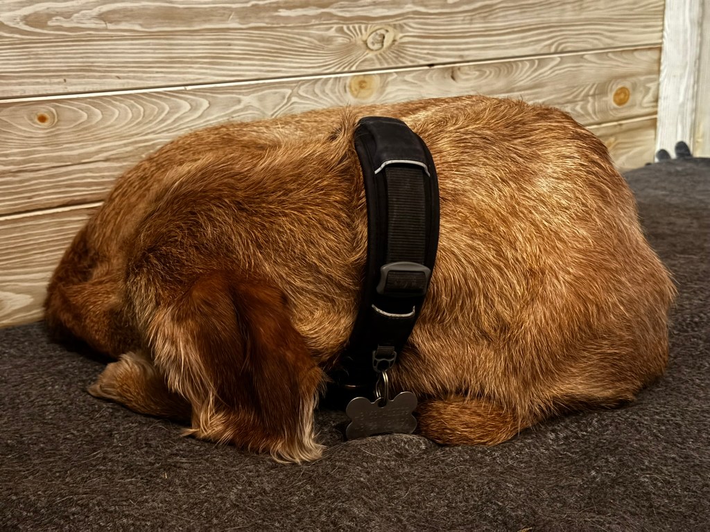Daarna was het voor mij wel klaar. In het bos met een loslopende Noor is voor mij geen ontspanning omdat zij altijd wel wat vindt. Lijn van Rebel aan de hare geklikt zodat ze iets meer lijnvrijheid heeft. Vooruitziende blik want de reebok passeerde ons een stukje verder van opzij. Enfin, lange route gedaan door middel van slingerpaden en mooi door het bos gewandeld. Me toch weer geërgerd aan andere mensen en andere mensen aan mij. Als ik op een heel breed pad, drie honden voor mij op zit heb, waarvan twee aangelijnd, dan laat je jouw Fidootje niet mijn cirkeltje in sjouwen. Toch? Nou, het hondje liep gewoon tegen Noor op en Noor kon alleen maar gaan staan en in de achteruit om hem te ontwijken. Mevrouw zei: oei, dat hondje is bang. Ik: ja, en terecht, want ik heb zit gegeven en nu moet ze gaan staan voor jouw hond, daar wordt ik niet blij van en dat weet zij heel goed. En Noor gelijk weer heel liefjes een zit gegeven. Weg waren ze. Daarna mijn drietal op zit gelaten en uitgebreid beloond met lieve woorden en de lekkere visbrokjes die ik nog over had.