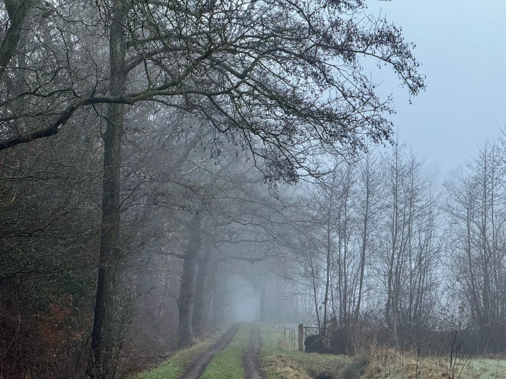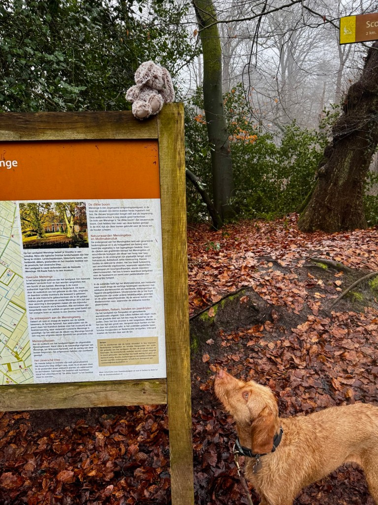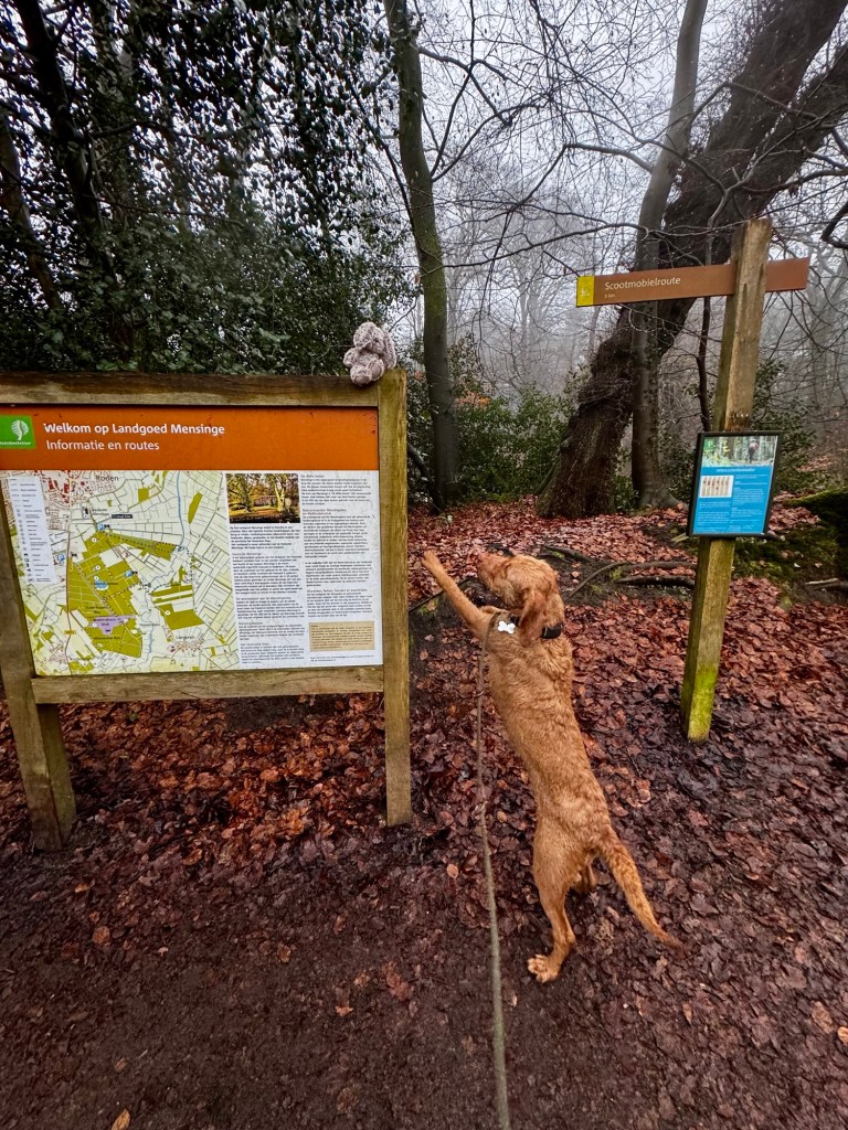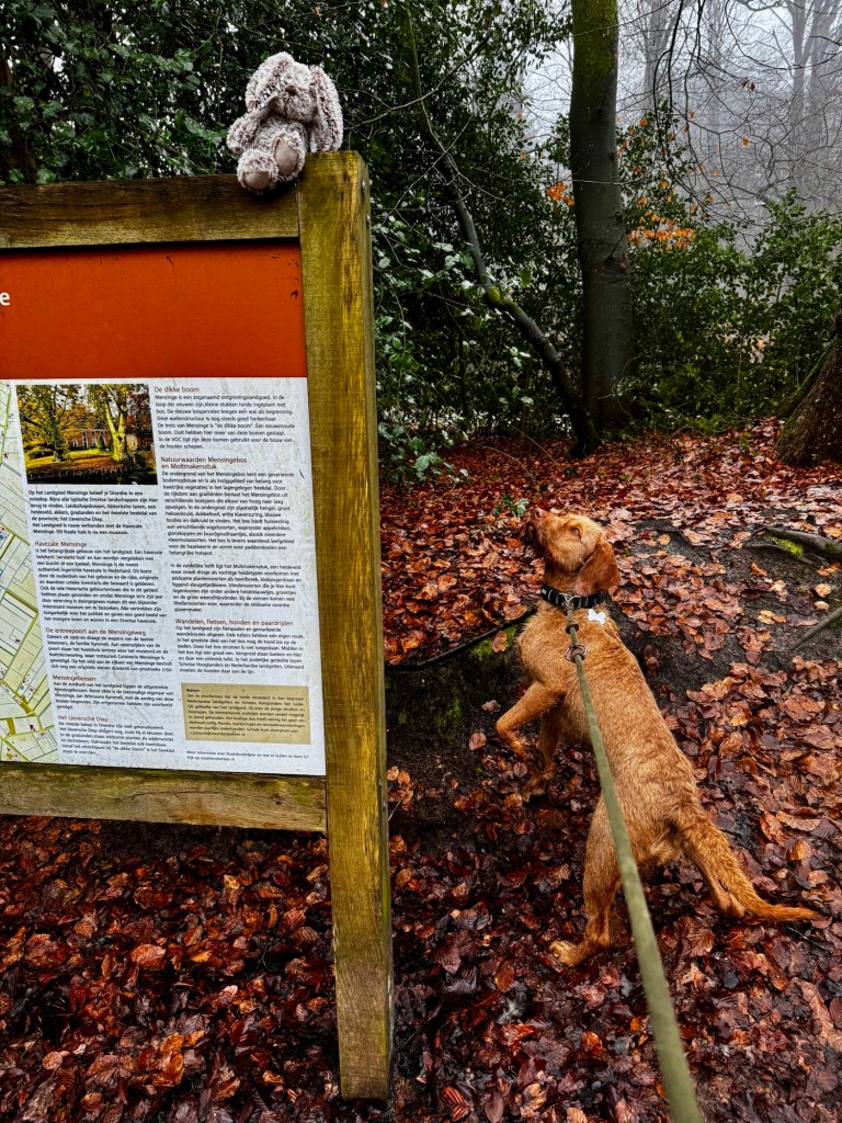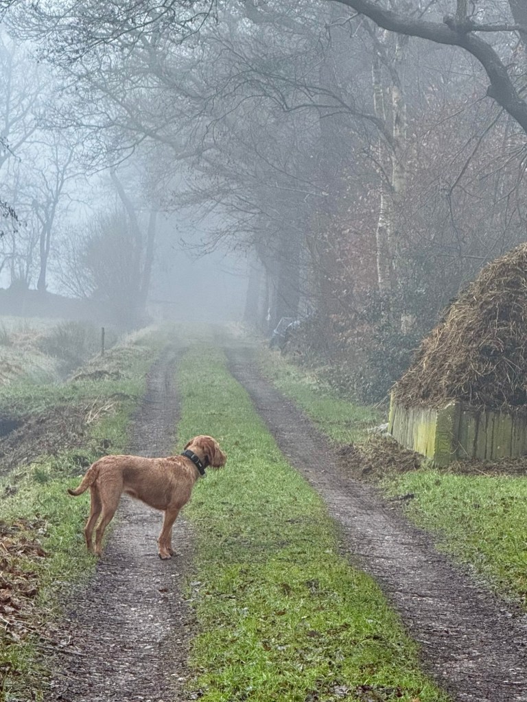 Om 8.00 uur de Mensinghe in. Mistig en fris. De honden hebben zin in vrijheid en krijgen die ook direct. We lopen een stuk tot Noor op een meter of 20 afstand van mij gaat pointen; gelijk gefloten en ze kwam onmiddellijk terug. Yesss. Vakkundig beloond uit de broekzak vol lekkere koekjes.