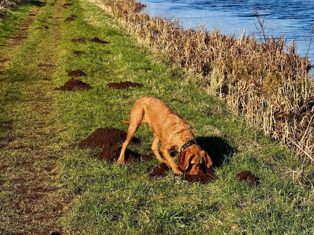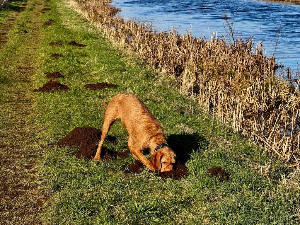 Koud maar met zon: rondje Mensinghe om de dag te starten. Noor had het druk met voor me uit sjezen en haar mollenjacht. Dan pas merk je hoeveel molshopen er op de route liggen…