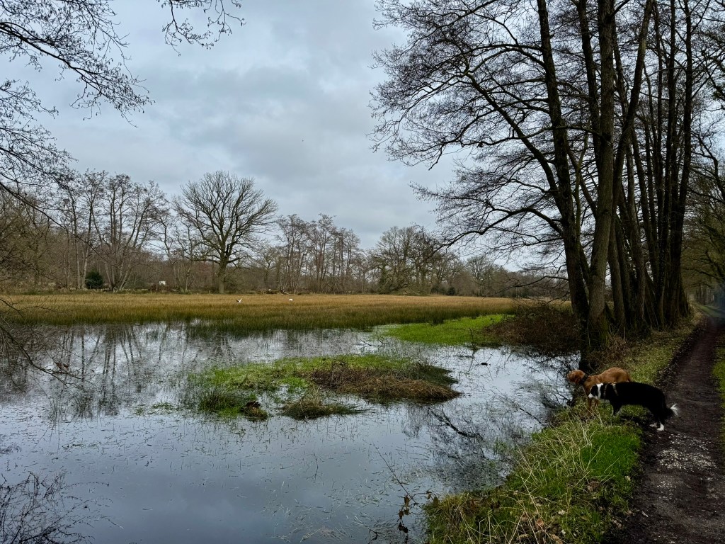 Ik roep Noor die uit beeld is terug, roep de andere twee bij mij en krijg Noor dan nog niet te zien. Dan er maar achteraan. Dan stuiteren er twee reeën op hoge snelheid springend door het landje naast mij in en als ik na de bosjes het land inkijk waar Noor in vertrokken is zie ik helemaal niets. Aaargh. Dan gauw weer terug in het andere landje kijken waar de twee reeeën te zien waren; ook niets. Dan toch maar weer teruglopen tot waar Noor verdwenen is en dan komt ze zwaar buiten adem bij me terug. Ik kan niets anders dan haar prijzen maar meer dan een goed zo Noor krijg ik er echt niet uit door schrik en boosheid. Aanlijnen dan maar en verder door. Boosheid en ergernis parkeren en aan goede dingen denken.
