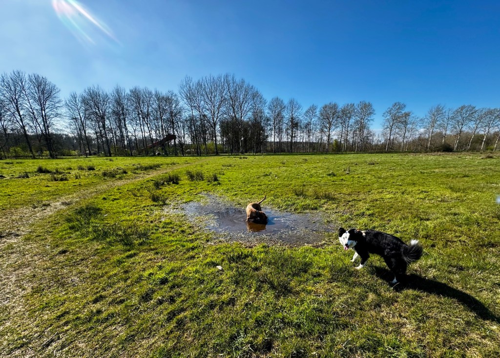 Dan lekker los op het uitlaatveld. Noor aan het werk in horizonflitser-modus over het hele veld en de andere twee vermaken zich met rollen in het gras en spetteren in de plassen op het veld. Noor leeft zich erg uit, vindt een klein vogeltje in het gras (dat tijdig wegkomt) en doet nog es wat aan wateronderzoek. Met zeer vies spul naar huis en door de drukte in het park ook uitermate lekker getraind.