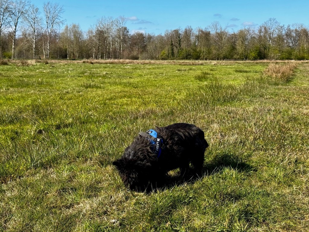 We kwamen buurvrouw tegen en tijdens het praatje liep Noor aan de “verkeerde” kant van de boom zodat de lange lijn om de boom heen kwam te zitten. Buurvrouw wilde haar gaan redden maar ik zei dat ze het gewoon zelf wel kan. Voor buurvrouw doorliep wilde ze dat wel even zien… Zo leuk; tegen je hond zeggen dat ze terug moet en linksom moet gaan om het te fixen. Noor doet het uitermate netjes en beheerst en buurvrouw zegt: waarom verbaasd het me ook nog? Heerlijk!