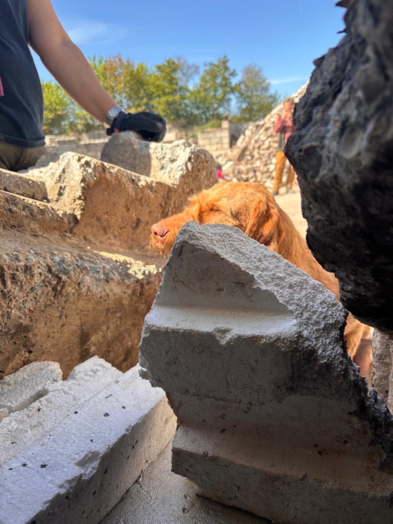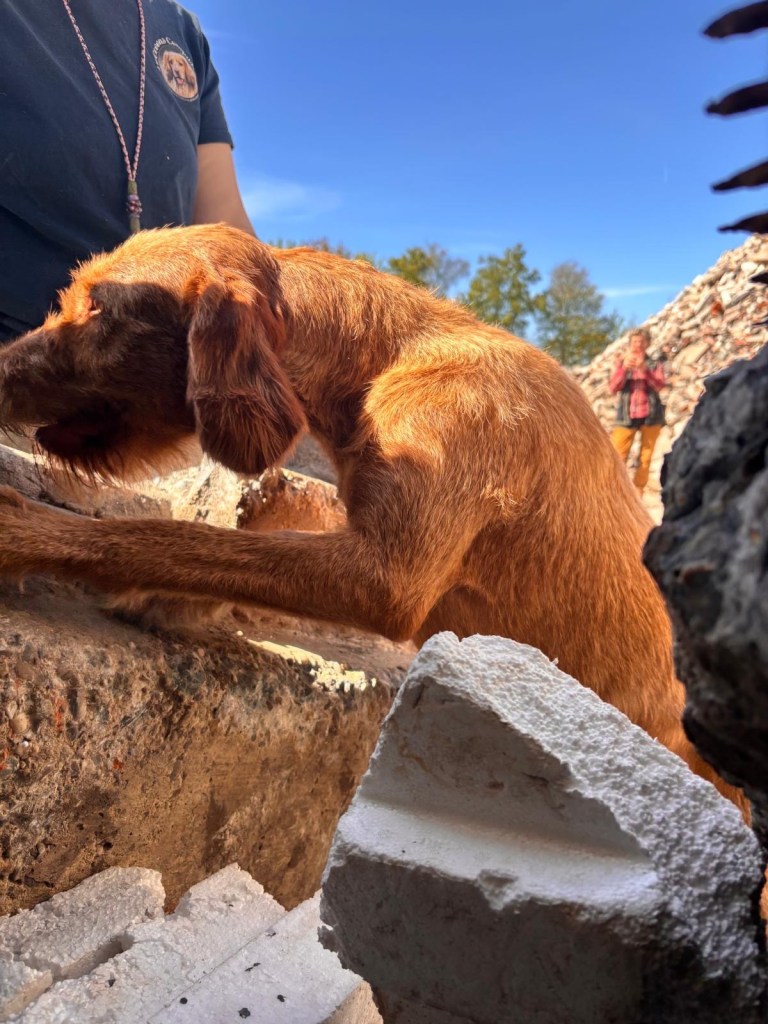 Na de lunch een moeilijker verstek. Onder oude brugdelen zit een mens verstopt en de ingang is dicht gemaakt met piepschuim. Trainingsmaatje F mag met zijn leenhondje richting verstek en dit onervaren hondje verrast ons allemaal. Ze pakt de mensgeur direct op en vind een opening aan de zijkant waardoor ze binnen 3 seconden na de losklik binnen bij het mens is. We zijn allemaal sprakeloos.
