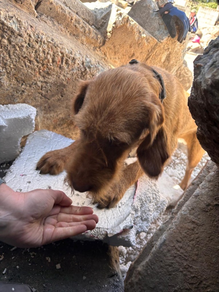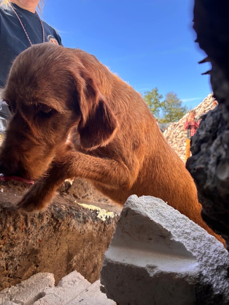 Hondjes weer in de auto en trainingsmaatje F verstopte zich in het zogenoemde verstek. Per hond drie keer het verstek in en als laatste een makkie zodat de hond met een goed gevoel terug de auto in gaat. Voor ervaren honden werd de opening dichtgetimmerd met piepschuim. Noor is natuurlijk voor het eerst dus zij moet de link leren leggen tussen voertje en mens zoeken. De trainster neemt mijn bakje met worst en fokt Noor daar mee op. Noor krijgt meerdere stukjes worst en dan verdwijnt het bakje met worst richting mens in het puin.